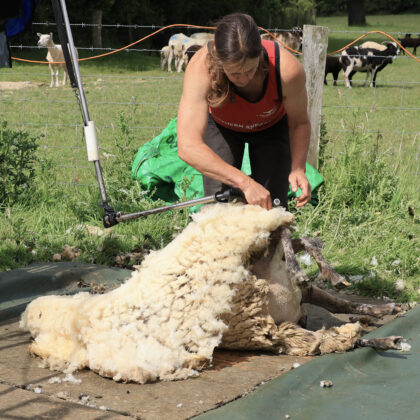 Jo first learnt to shear at Plumpton College and then went wool winding for Mick Cutting. Wool winding is the process of taking wool fibres and winding them into a more manageable and usable form. He gave her a stand and taught her to shear to a much higher standard. She has been shearing now for twenty-five years. She and her husband Mick also run five hundred ewes of their own.