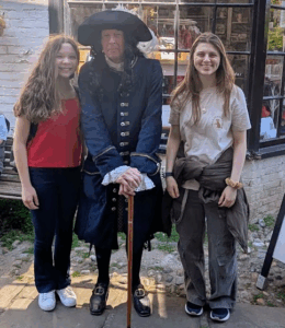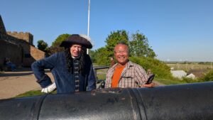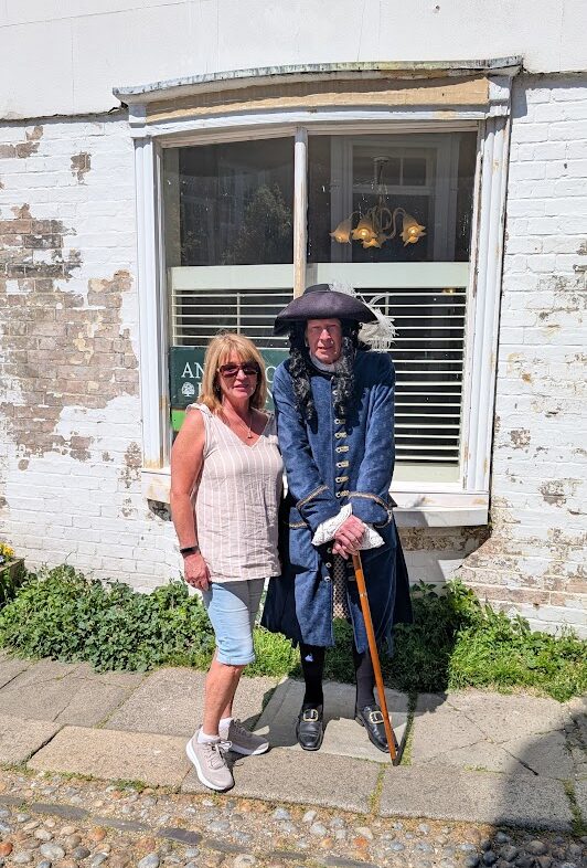 This figure was clad in a dark blue velvet suit with breeches and a tricorn hat, from which sprouted a long white feather. As we drew closer, the figure doffed his chapeau – and from this action, the conversation began.