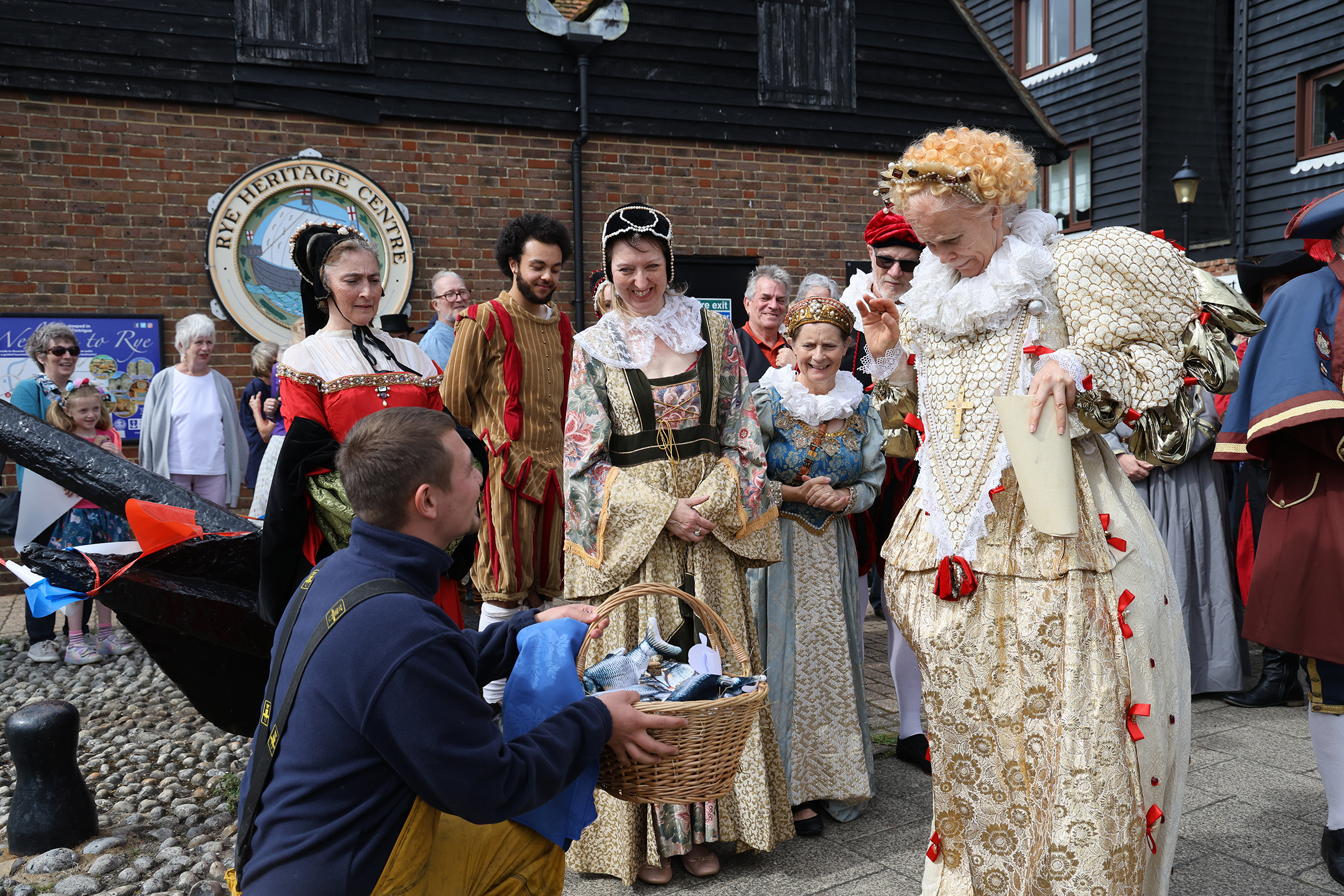Starting at the the bottom of Conduit Hill, the procession made its way along the High Street and Mint to Strand Quay. In front of Rye Heritage Centre fisherman Dan Chapman presented the queen with some Rye bloaters. They may not have an appetising name, but Dan says they’re great to eat “They’re not too fishy, just enough to tell they’re from the sea, but they’re one of the best fish you can catch round here.”