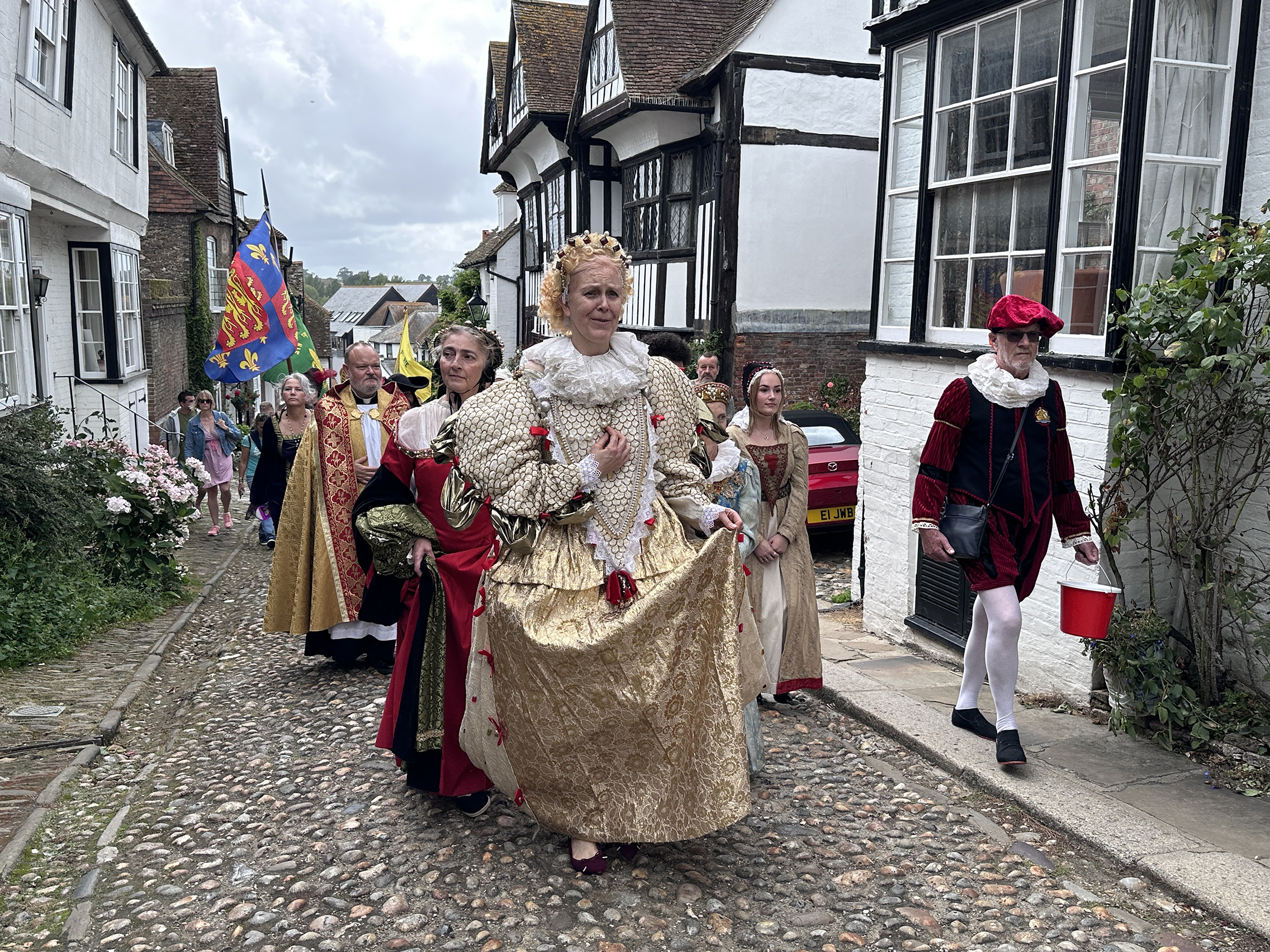 Actors from the Rye Players led the procession with Clare Hammond playing Queen Elizabeth I in full regal costume, her first time playing a royal. “It’s been absolutely extraordinary being the centre of attention. A remarkable day.” Accompanied by ladies in waiting, and a history defying cameo from King Henry, the queen negotiated the cobbles waving to cheers and stopping at locations around Rye.