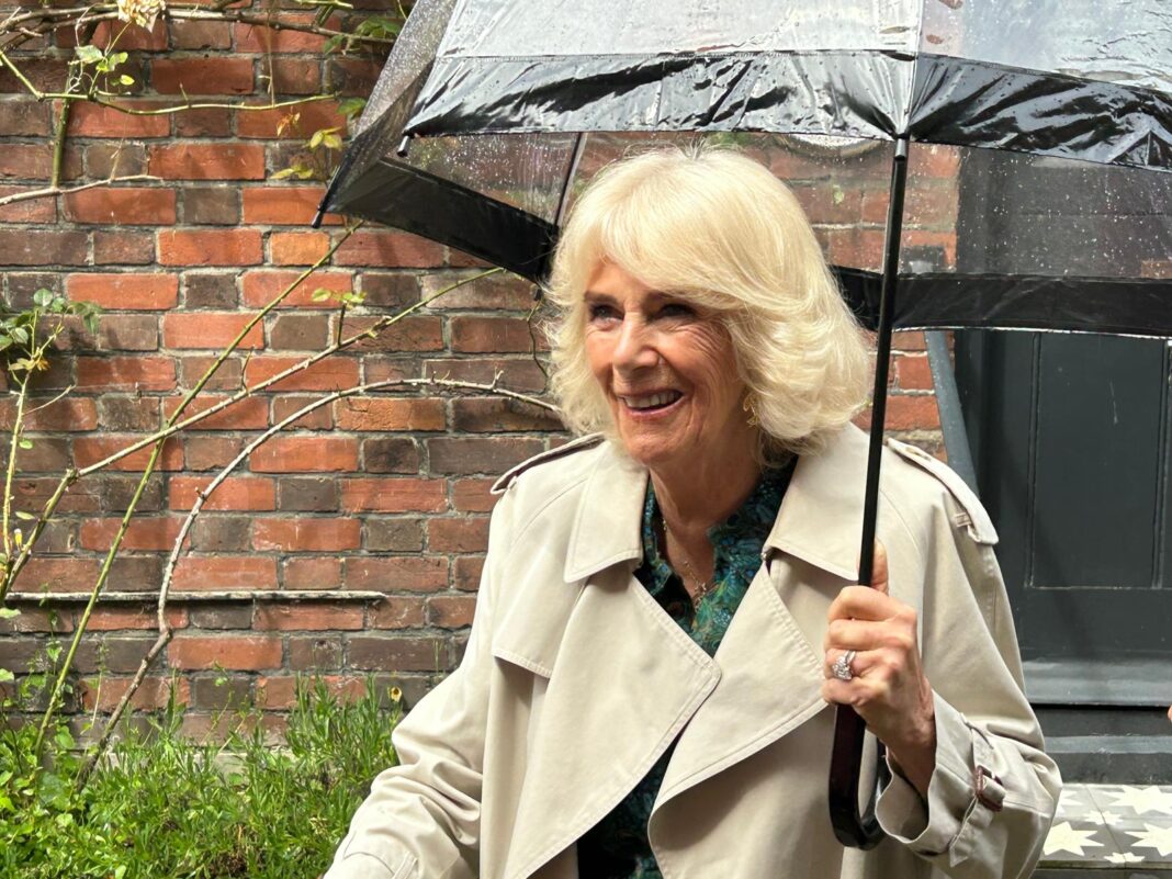 The Queen arrived at the town hall to be greeted by the school children on the path up to the church. She stopped to chat, posing for photos and collecting flowers in spite of the heavy rain, before heading into St Mary’s.