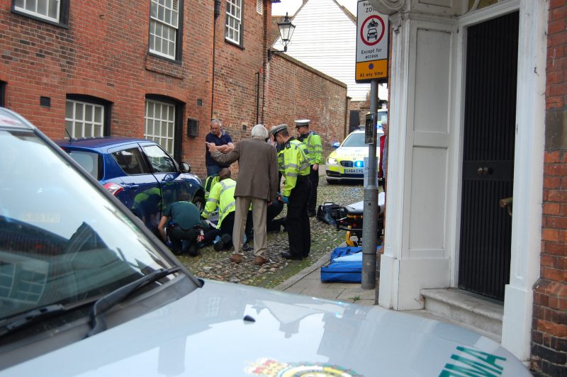 An elderly person was knocked down by a car at the bottom of West Street, Rye at approximately 3:45 pm on Tuesday afternoon, October 17. Ambulance crews including a critical care paramedic attended the scene. The woman was assessed and treated for a leg injury before being taken to Conquest Hospital. The Suzuki Swift car was apparently reversing towards the High Street.