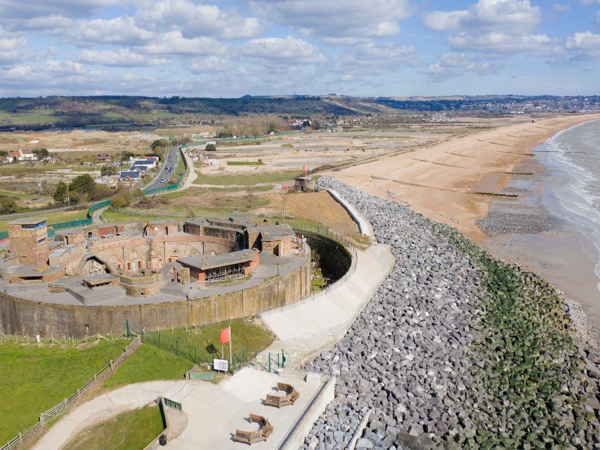 The Hythe stage helps reduce flood risk to 787 properties and the important Ministry of Defence firing ranges immediately behind the beach. Work started as the Covid-19 lockdown began and has involved refurbishing the timber groynes, placing rocks imported from Norway to reinforce the revetment around the Dymchurch redoubt and recharging the shingle beach with dredged gravel.