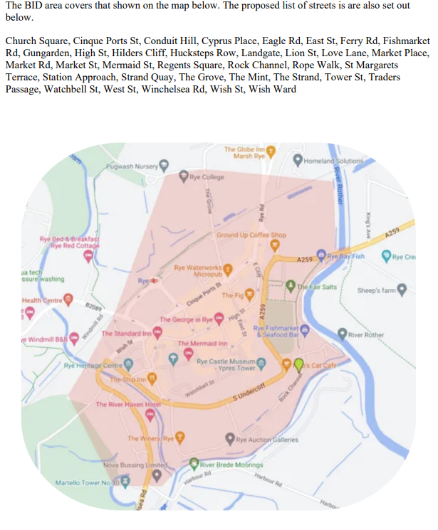 If I may correct some misunderstanding here. 1) The early consultation document provided to businesses did include some suggestions of events and festivals but following the extensive public consultation these have been removed. The final business plan has a much greater emphasis on public realm improvements and this is directly as a consequence of the feedback and suggestions made by businesses in the town. 2) Not voting is absolutely not an automatic yes vote. For the BID to be constituted it will need to win the ballot on two majorities: it will need to have the majority of ‘yes’ votes and those ‘yes’ votes will also need to have a combined rateable value that is greater than the combined rateable value of the ‘no’ votes. This is an important check and balance to ensure parity between small and big businesses and is fundamental to all BID ballots. 3) a BID is designed to deliver a clear and measurable return to businesses on projects that they themselves determine. 4) Infrastructure issues in Rye will continue to be the responsibility of local government although Local Government Reorganisation means future care of assets like The Landgate is yet to be determined. 5) the final business plan on which eligible businesses are being asked to vote can be found at http://www.ryebid.co.uk there is also a comprehensive Q&A and a shorter fact sheet to help dispel myths.