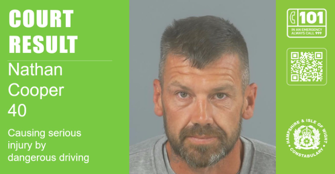 Cooper was sentenced at Southampton Crown Court on Friday October 10 to four years and three months imprisonment after pleading guilty to causing serious injury by dangerous driving, drink driving, drug driving, and assault occasioning actual bodily harm.