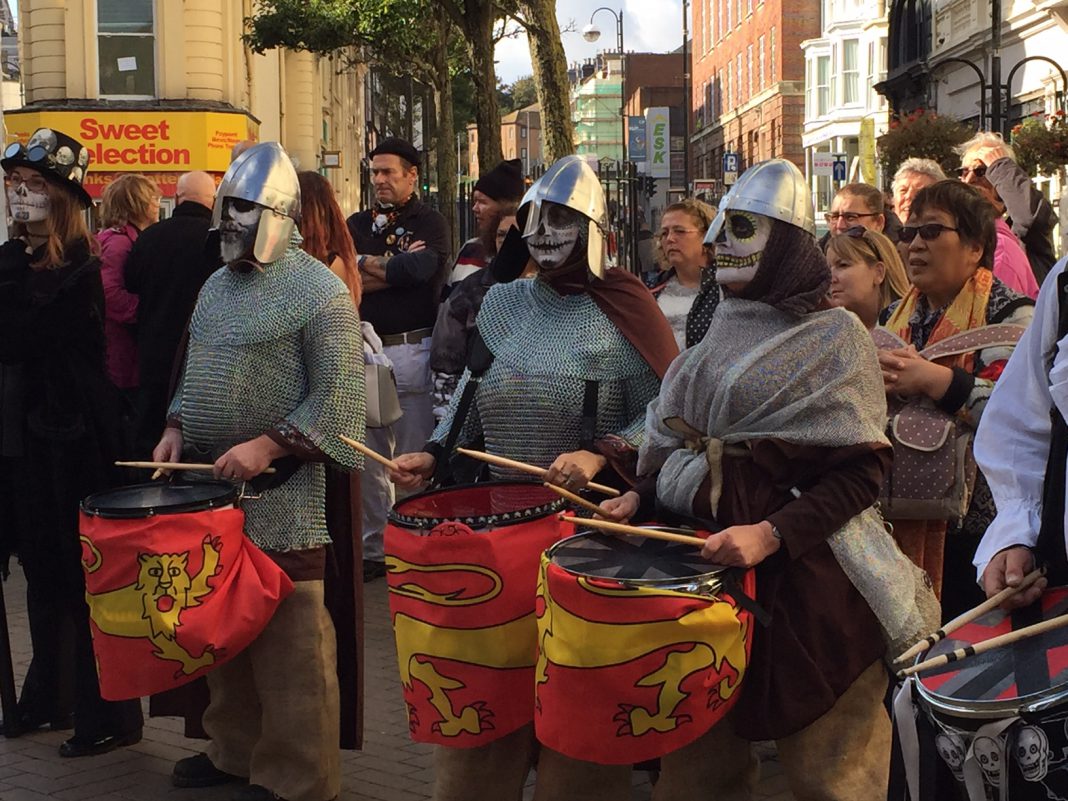Immediately after, it was time for the procession. The storm clouds gathered, spots of rain started to fall, the wind whipped up and took some spray from the sea. So, a lovely English autumn’s day. A giant, Saxons and Normans, marching bands, quite a few bonfire boys (and girls), a walking maypole and his attendants – all human life was there. We even saw some police officers and signs of parking enforcement – sights almost unknown in Rye. The procession went past and the heavens opened. It seemed as though everyone at once rushed to the Jenny Lind, where Teachest Blue were performing live. This was a great vantage point as the parade came back down the High Street so we could see them all again. We hope they managed to get somewhere warm and dry before the bonfire night celebrations began in earnest a couple of hours later .