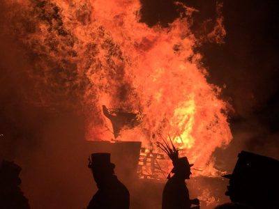 Rye Bonfire hosted some 16 other Bonfire Societies and marching bands from all over Sussex last weekend, one of the highlights of the evening was the launching of the ashes two of its long serving members, John Izod & Jimper. We are not sure exactly how this came to be, lost one suspects in a murky evening over an ale or two…