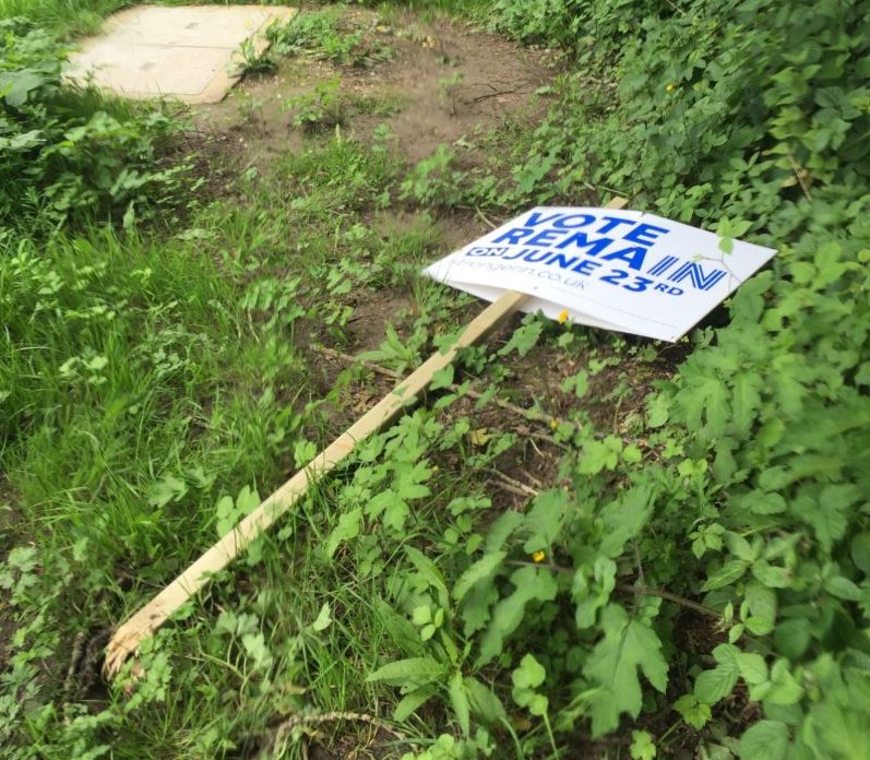 Brexit seems to be the default position of most farmers or landowners if the signs along the Udimore road are anything to go by. But there are indications that foul means are being employed to maintain the anti EU crowd’s dominance of the landscape. Two remain signs were vandalised last weekend, one had an “out” poster stuck on top of it, the other was knocked down and broken, reports Seana Lanigan.