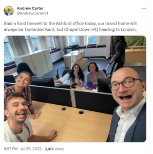 The company still plans to continue growing grapes at Small Hythe, alongside specialist wine making and vineyard tours, however Andrew Carter has also confirmed Chapel Down’s HQ has now moved to London. In a tweet he says “Said a fond farewell to the Ashford office today, our brand home will always be Tenterden Kent, but Chapel Down HQ heading to London.”