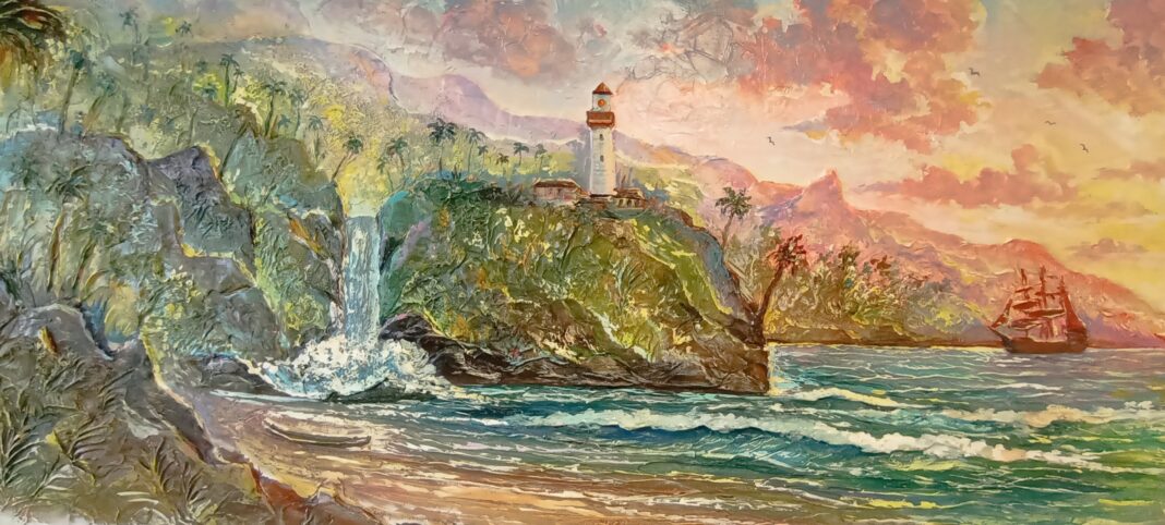 A statuesque figure of a man holding a trident is the next subject matter then a lighthouse perched on a cliff edge overlooking a calm sea with cascading waterfall. A galleon leaving the shore is another fabulous painting and a pair of deer resting and drinking from the rivers edge.
