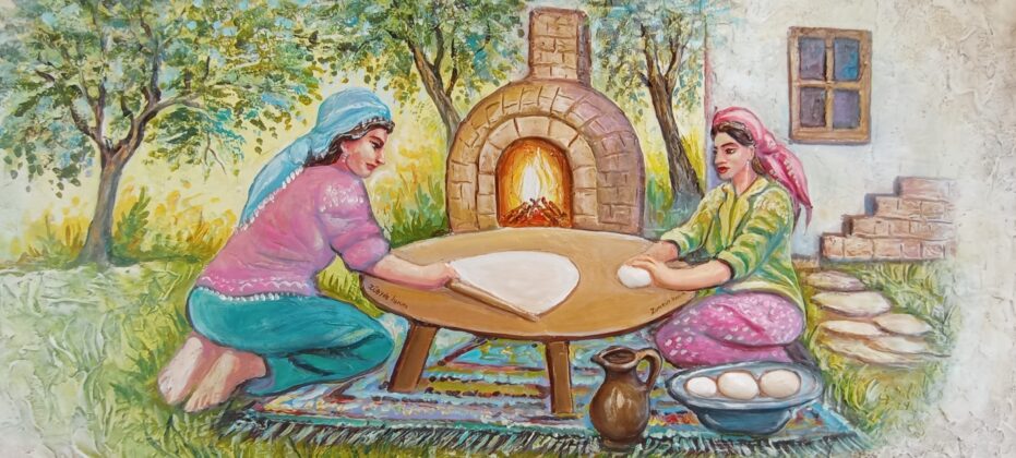 Further into the building is a scene of two women, making bread in the garden with a clay oven then two men sat amongst sheep overlooking a lake, one in deep contemplation, the other serenading him on a lute with his faithful dog beside him.