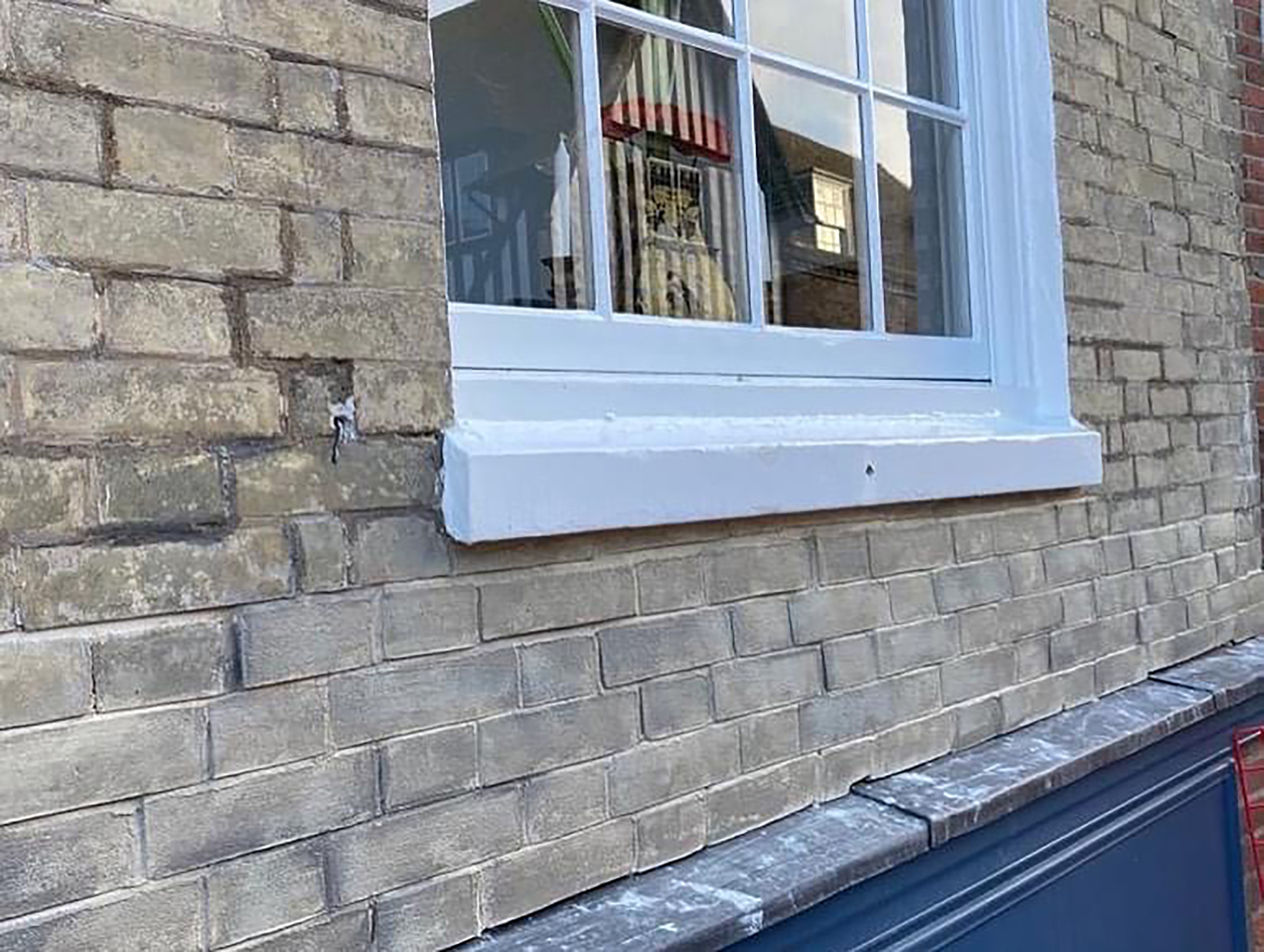 “We started a scheme of repairs above the shop-front following damage to the mathematical tiles by shop-fitters when they had installed the hoarding some twelve months previously. It had been assumed that it was brickwork when the hoarding was fitted. Consequently, when the hoarding was being taken off the tiles came away with it.