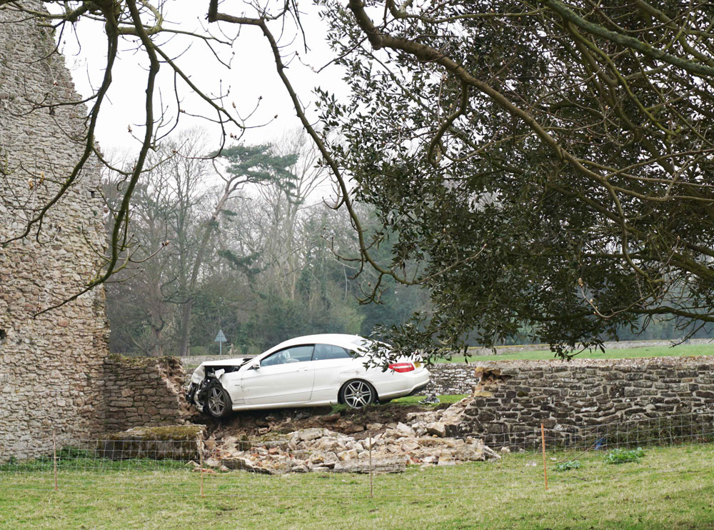 A stolen car, cutting through Winchelsea early on Easter Saturday, hit and demolished a long section of a 14th-century wall, part of the ruins of the Hospital of St John. The car overshot the bend at the bottom of Monks Walk, crossed the grass verge and collided with the northern side wall of the hospital. The car, a white Mercedes E350, had been reported stolen in Kent. The thief or thieves fled before the police arrived on the scene. Anyone who might have seen what happened or who might have other information is asked to email 101@sussex.pnn.police.uk or phone 101, quoting serial 254 of 4/4.