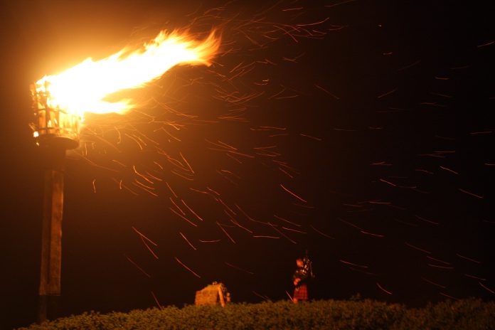 “At 9pm on the anniversary a procession of 50-60 adults and children formed up at the New Hall and were then led by a quality bagpiper across several fields to the beacon. Winchelsea’s Rector, myself and two immaculately turned out Sea Cadets followed, trying desperately to keep in step and at the beacon we were met by David Merrifield (Senior), a veteran of World War Two, and his son of the same name, to complete the advance party.