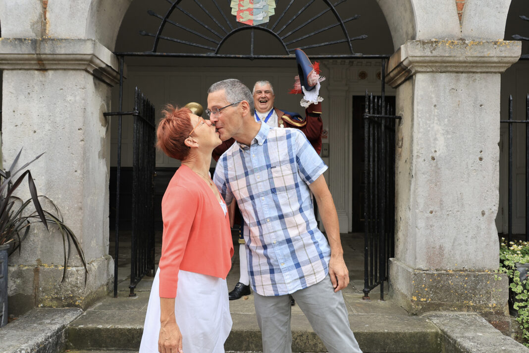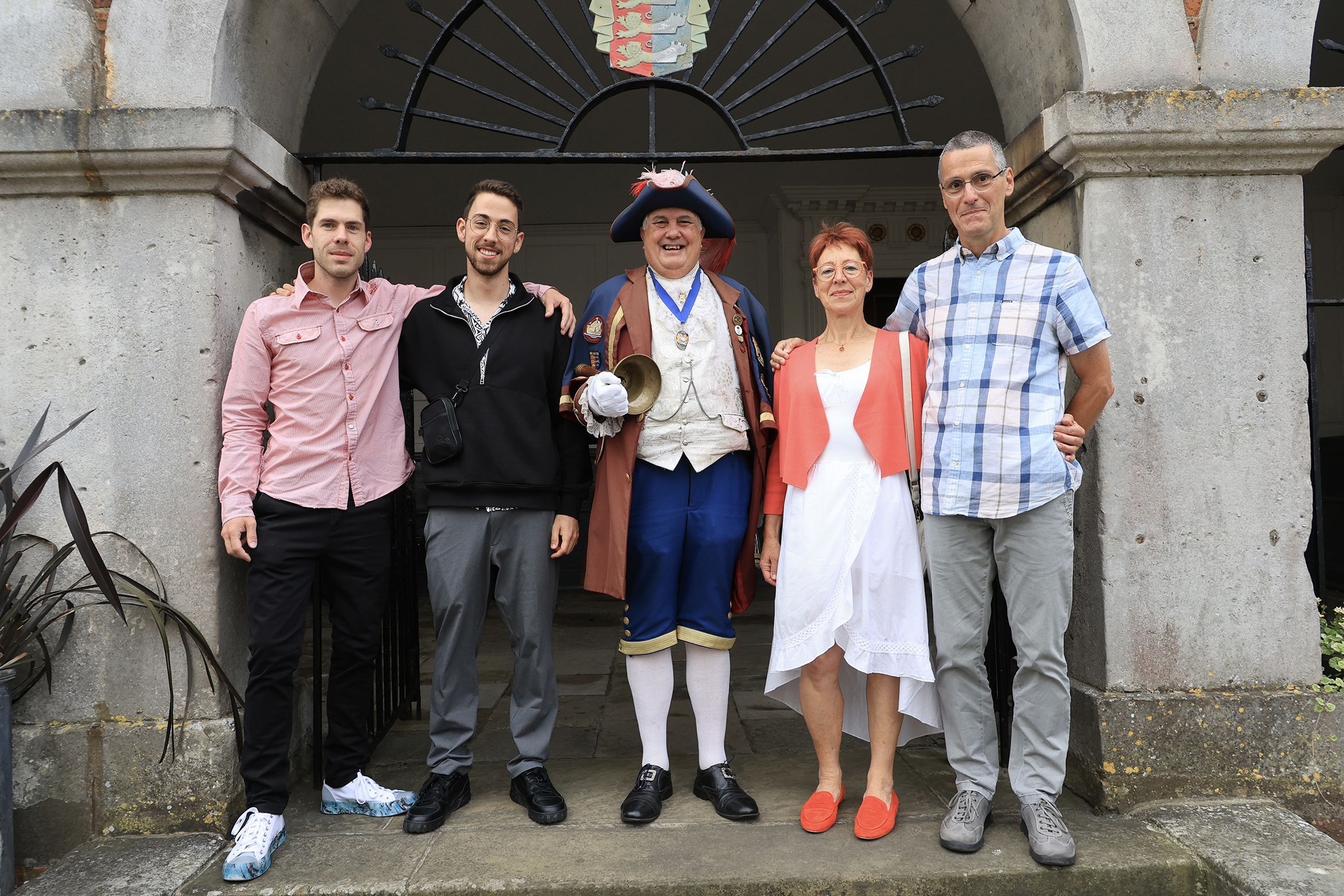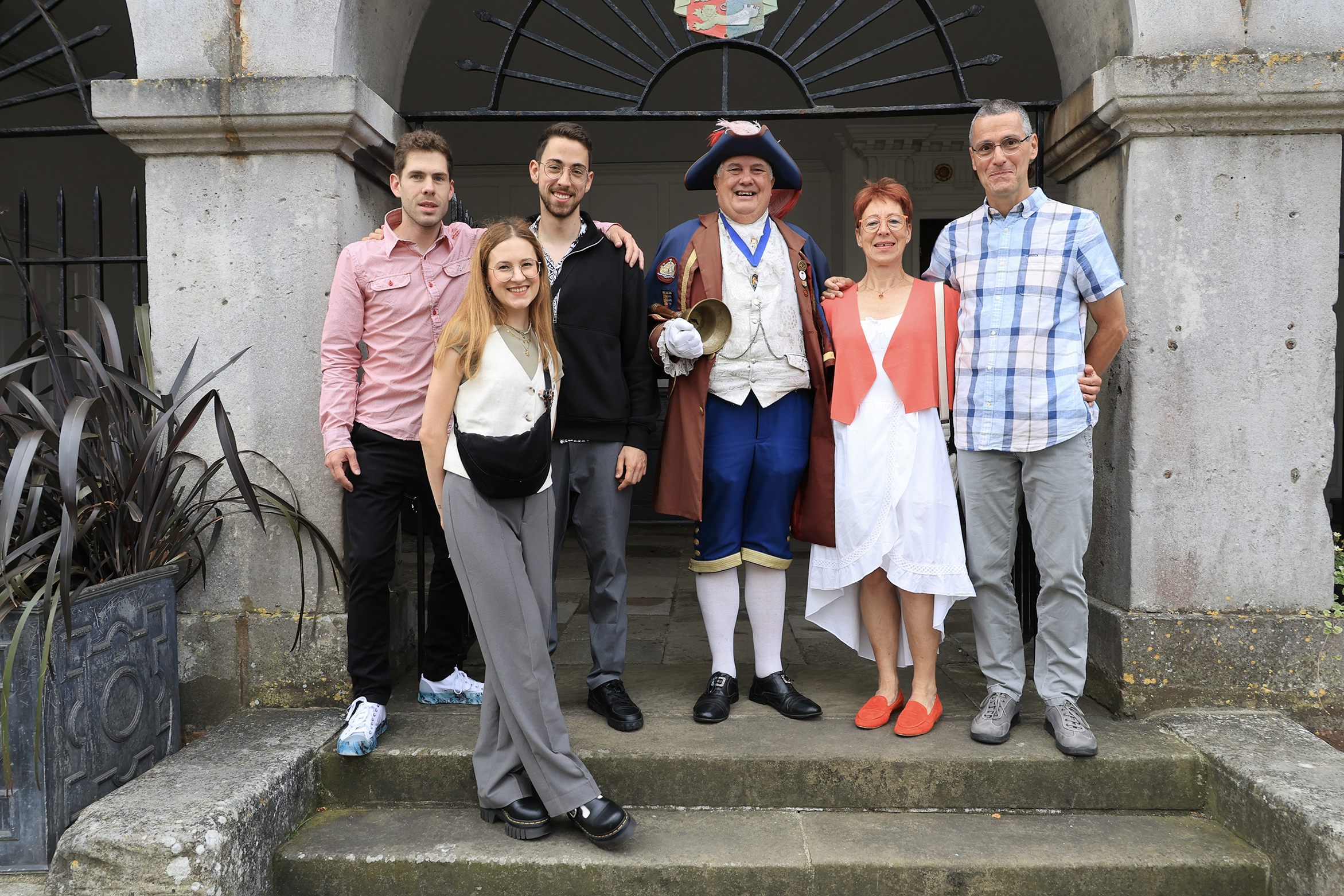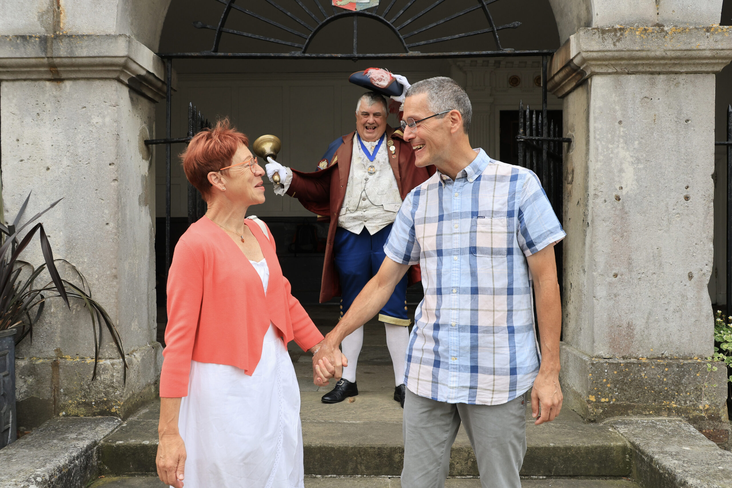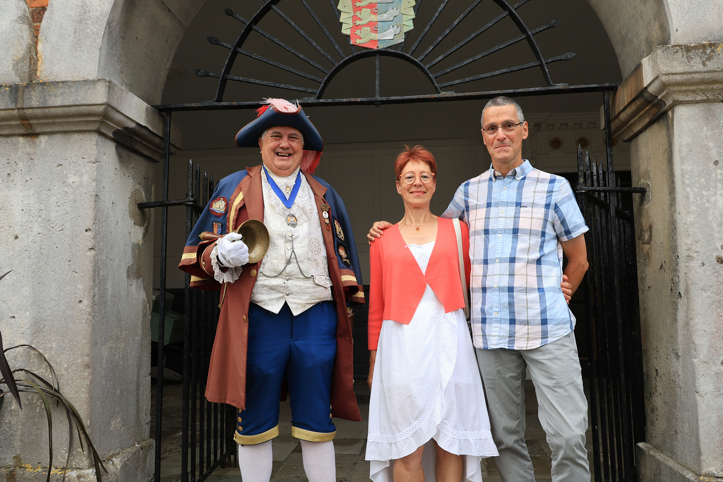 There was a family discussion with their sons Jan and Alexander about returning to Rye to celebrate the silver wedding anniversary in July 2024. Plans were set in motion but little did the parents know that their sons had come up with a very special idea to make the visit more memorable. They contacted Jessica Neame at the Town Hall and explained the story of their parents’ marriage and asked if they might be allowed to bring them inside the Town Hall to re-live special memories. Jessica added to their surprise by asking Paul Goring, The Town Crier, to make a special cry, which he did, including some parts in German.