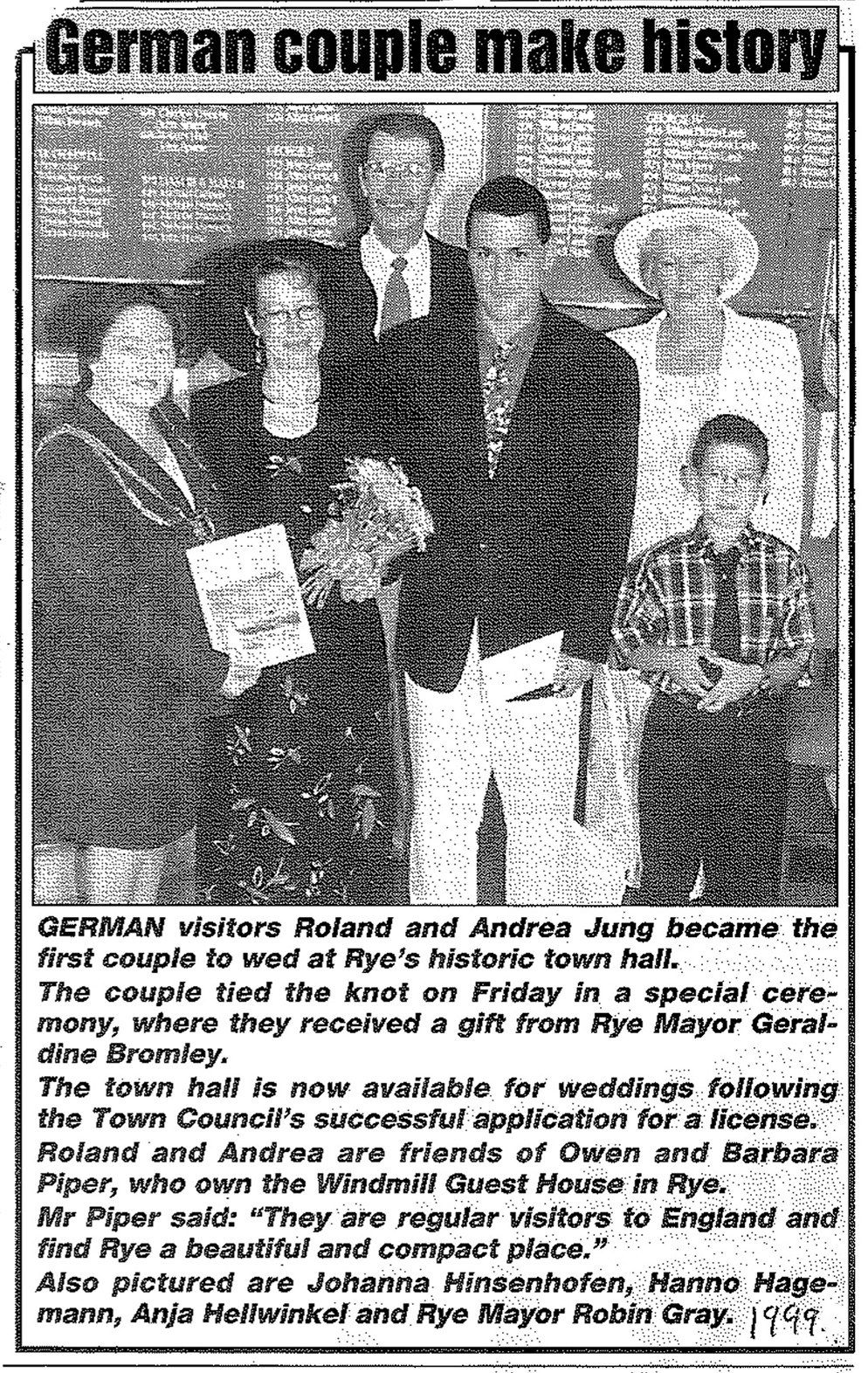 In July 1999 Rye Town Hall’s application for a wedding venue licence was granted and the first couple to be married there on July 23 was Roland and Andrea Jung, from Düren, in Germany. They had often visited Rye and were friends with Owen and Barbara Piper, owners of the Windmill. Rye was a special place for them, made even more special as it was the place where they tied the knot.