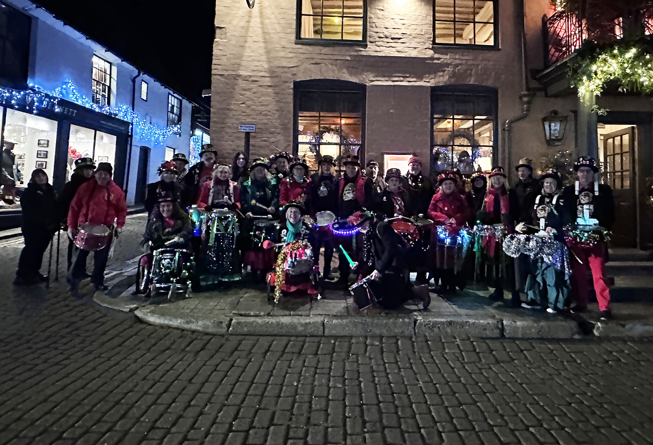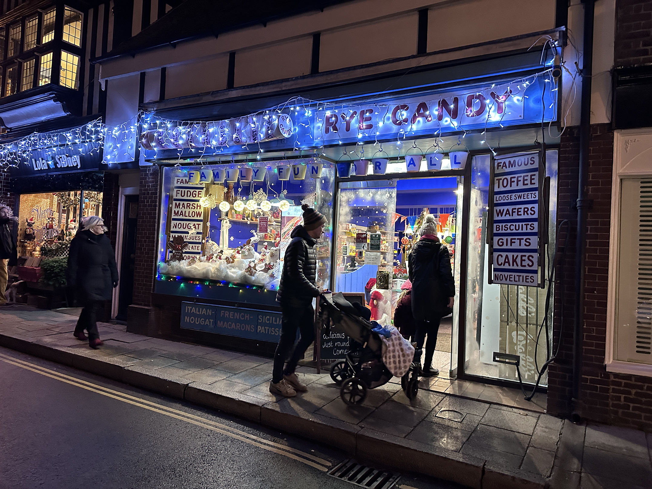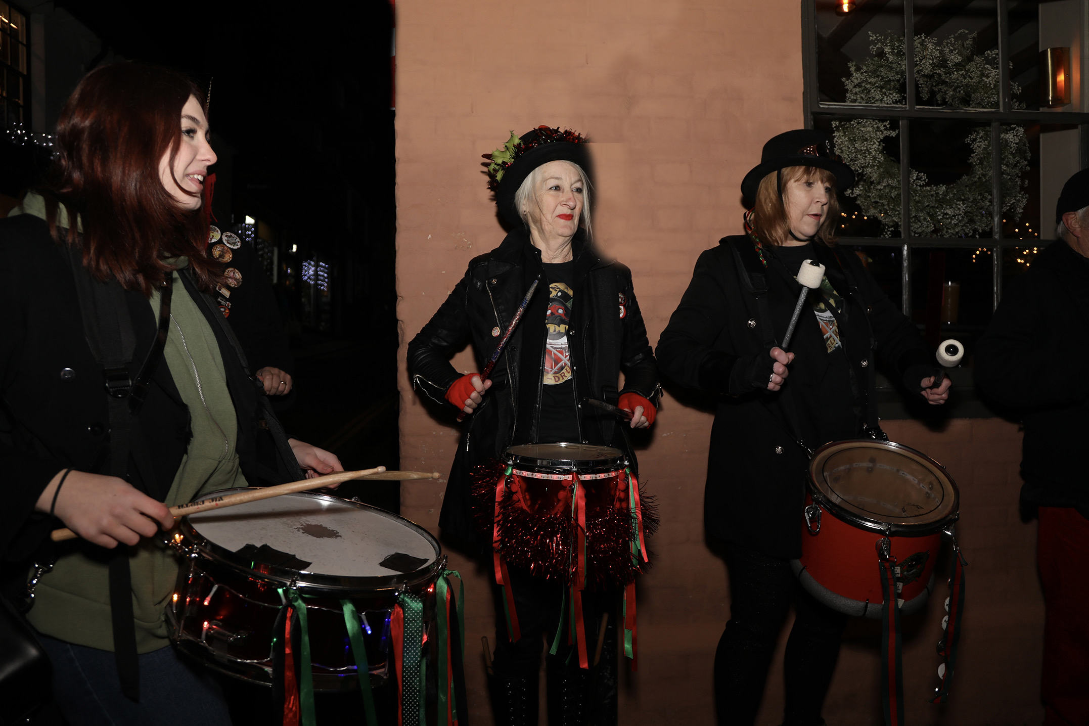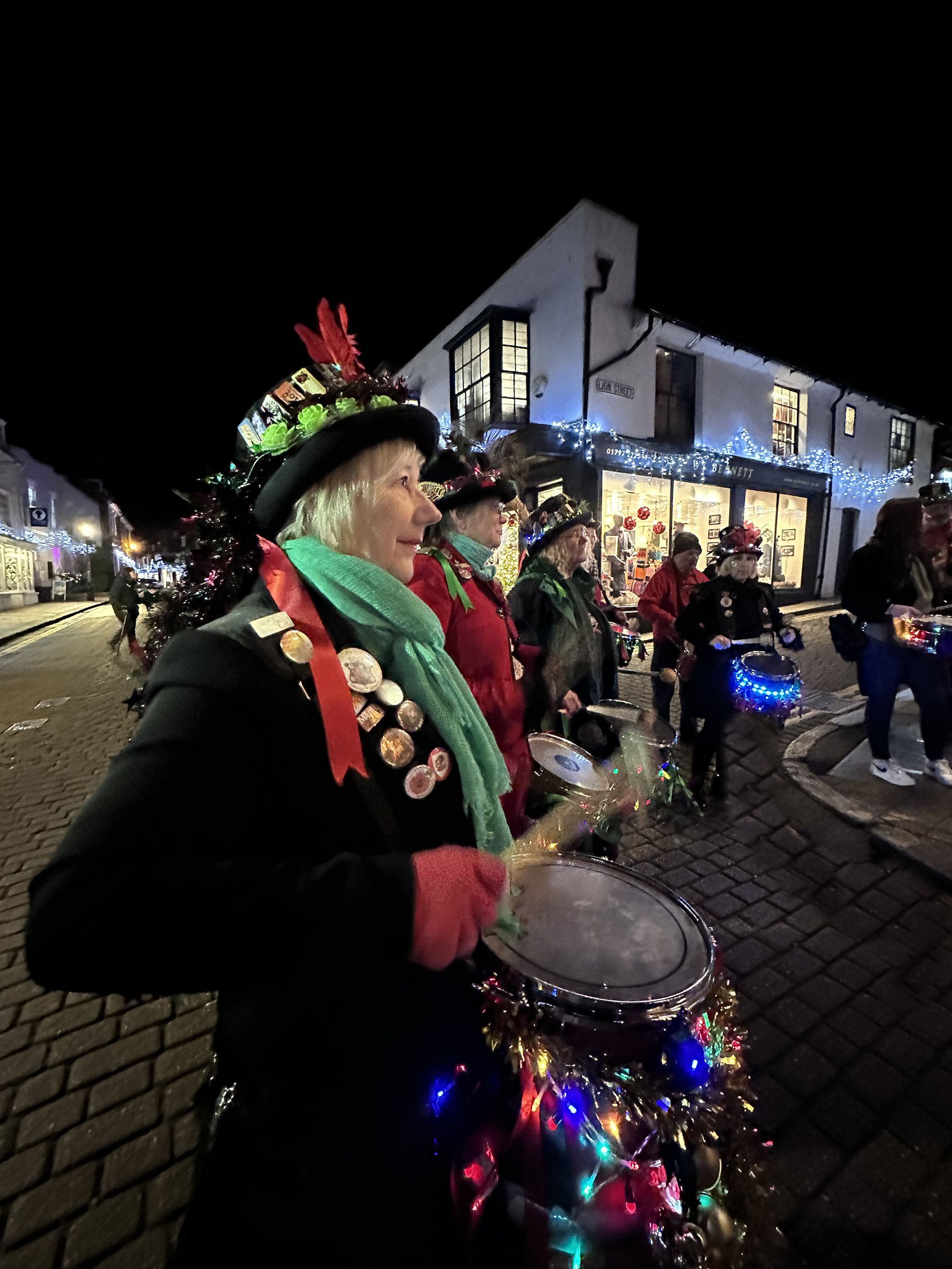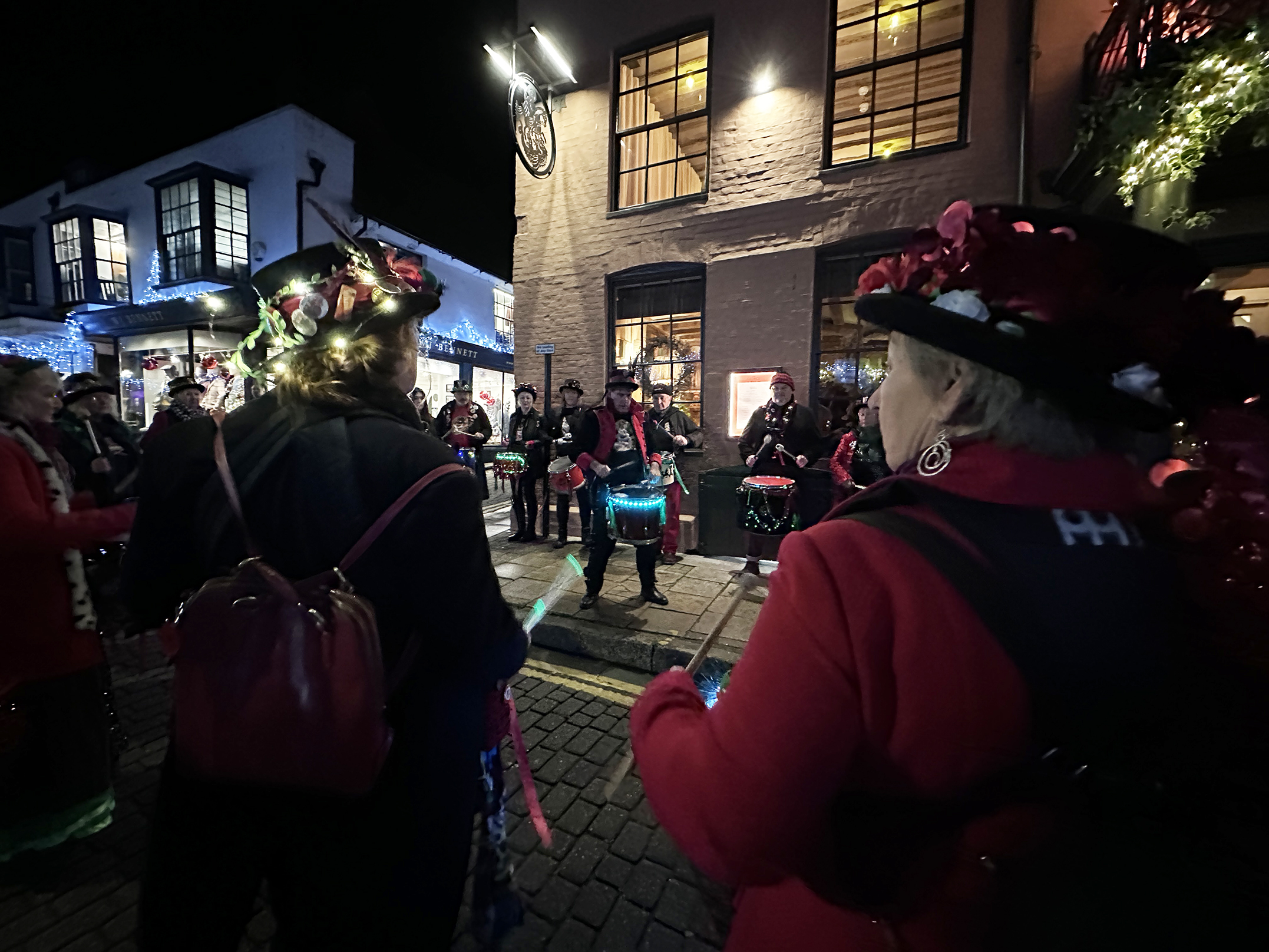 Everyone clapped and cheered “Happy Christmas!” Andi then thanked Sienna and the assembled guests, all the businesses and townsfolk in Rye who were taking part in the two-day Christmas extravaganza, and wished everyone a happy Christmas. The town was a blaze of lights, sights, sounds and smells as a group of us wandered through the streets. As we walked up the Mint the deep rhythmic sounds of Ryebellion drew us nearer.