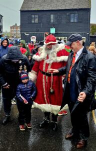 But there is no storm greater than the joy on a child’s face when they see Santa Clause. Down on Strand Quarter, with her customary warmth and hospitality, Sarah Warry-Mckie invited Father Christmas to make the Old Borough Arms his Rye headquarters once again. At 11.00am and followed by his elves, he descended the stairs into a sea of ecstatic children, dressed up and totally oblivious to the weather. He was received, as befits his status, by Mayor Andy Stuart and the Town Crier, Paul Goring, before making his way to his grotto at the Landgate.