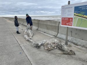 The two seals – one fitted with a tag from RSPCA Mallydams Wood at Fairlight – were found in a fishing net washed up at Broomhill Sands. The net also contained dogfish and crabs.