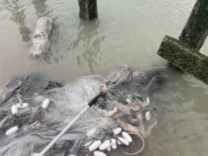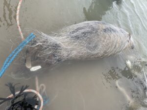He says on closer inspection they discovered the two seals caught in the net. “We rushed home to collect cutting equipment before removing the net from the sea. The tide was racing in and we had to work quickly to free the seals. Sadly, there was no sign of life and there were a lot of tears as we let the seal carcasses be taken away by the tide. They are such beautiful animals and it is so sad what has happened to them. This type of drift net causes untold damage to sea mammals.”