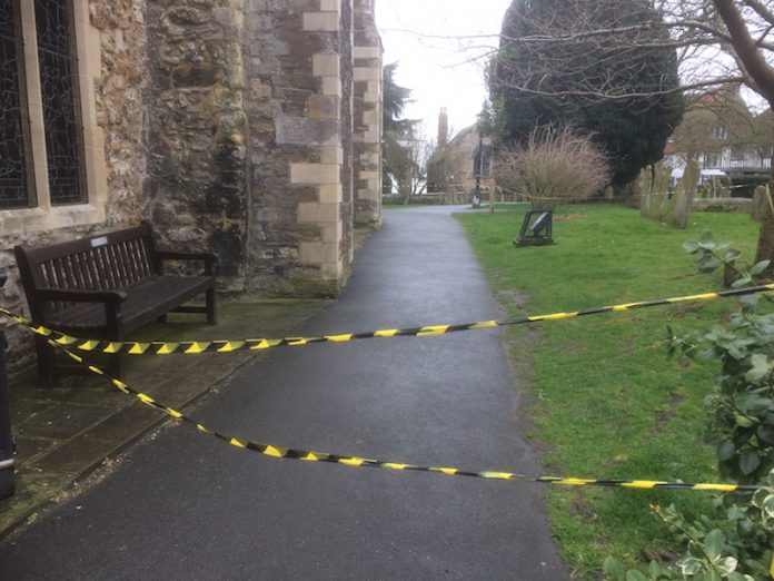 The Church are taking this matter very seriously, the Diocesan experts responsible for St Mary’s and other ancient buildings have been consulted and it is their advice that the problem is likely to be caused by ironwork reinforcing bars having rusted and now fracturing the masonry to the extent that the finial was dislodged. The extent of the problem has to be assessed and will need scaffolding at significant cost. A stone mason and the church authorities are investigating and until we receive their report the path will have to remain closed.