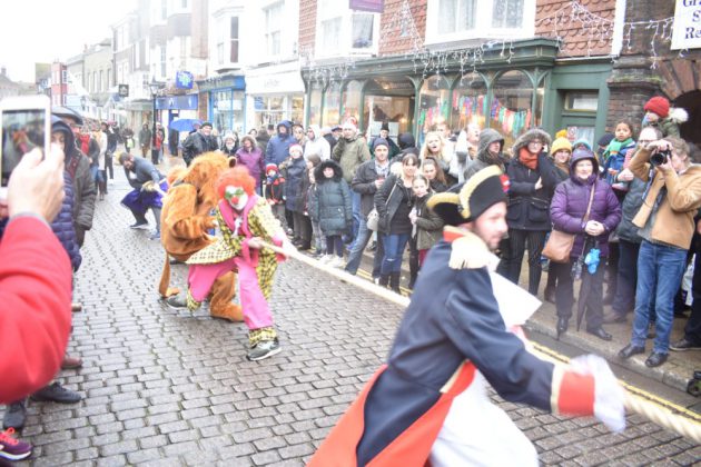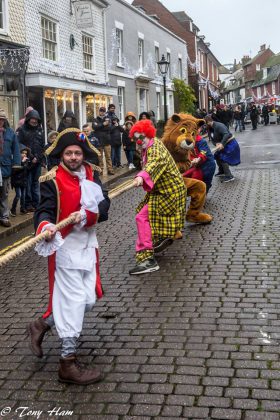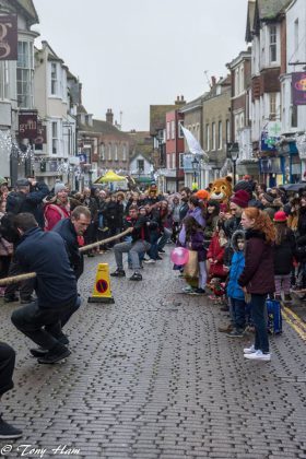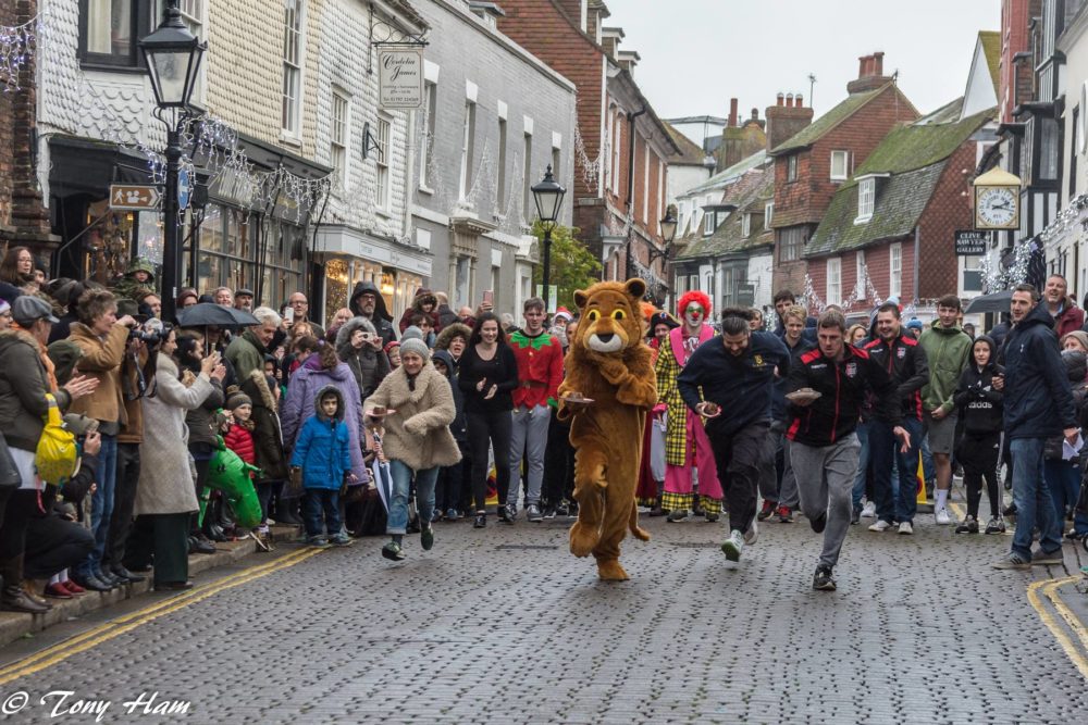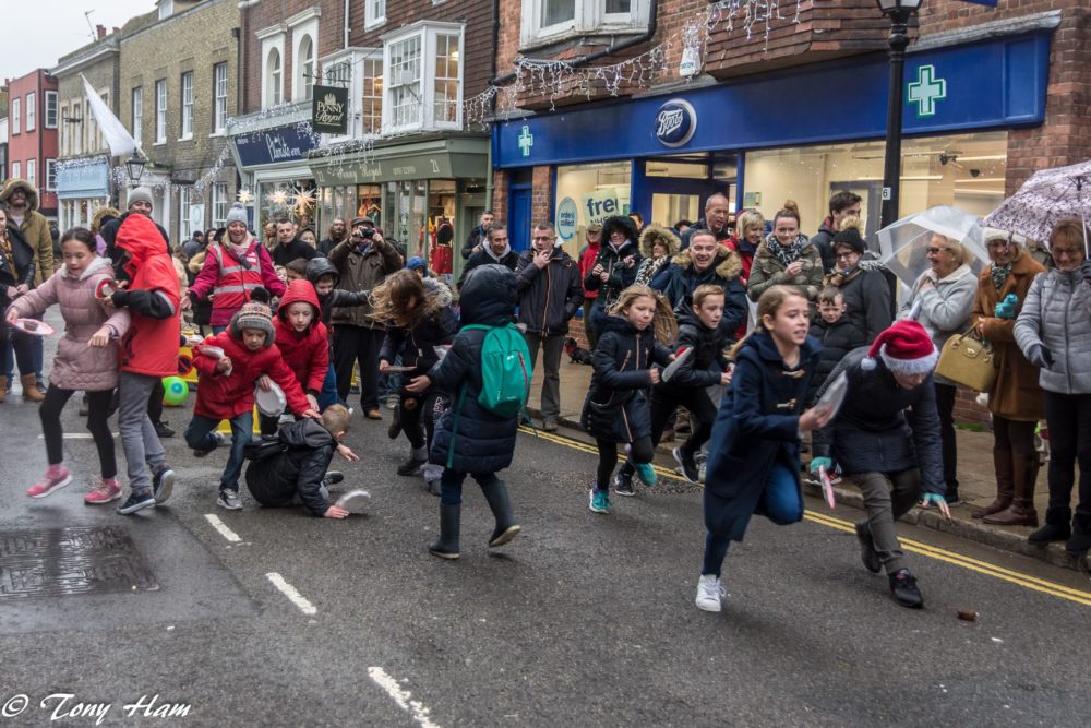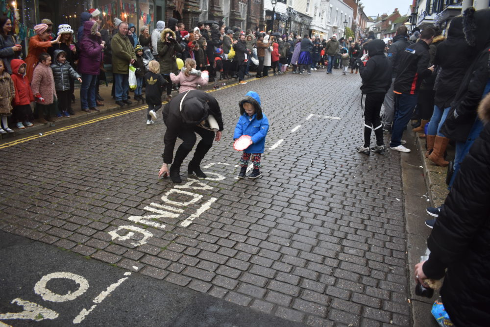 A star attraction is always the Christmas pudding race where competitive spirit usually exceeds the ability to keep the pudding on the plate and this year was no exception. The main race was won as usual by a team from the Mermaid Inn. In the children’s race the advantage of a blatant false start by some of the competitors was wiped out by a ‘Foinavon‘ moment at the turn which saw arms and legs flying and puddings being scattered. However, encouraged by the crowd everyone picked themselves up and finished the race although not all the plates still had puddings on them.