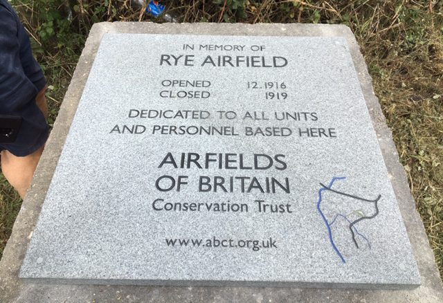 To commemorate the first world war airfield (1916-19) on farmland to the east of Rye in East Guldeford Parish, Rye and District Royal British Legion (RBL) has installed a stone memorial with a plaque provided by the Airfields of Britain Conservation Trust at the side of a lay-by on the Camber Road (see the orange circle on the map below). It overlooks the site. The airfield was used for training and to deploy home-defence aircraft to counter the German airship threat.