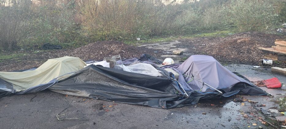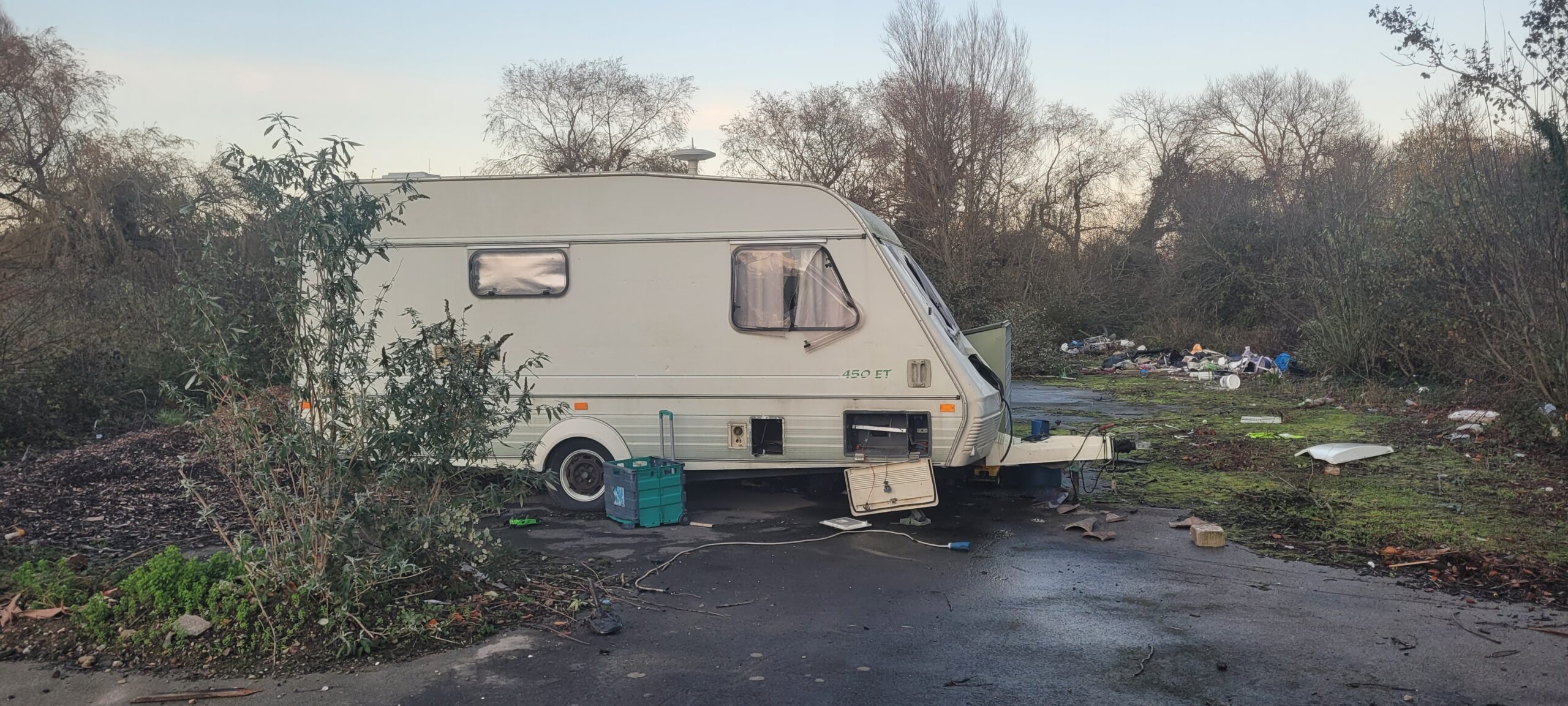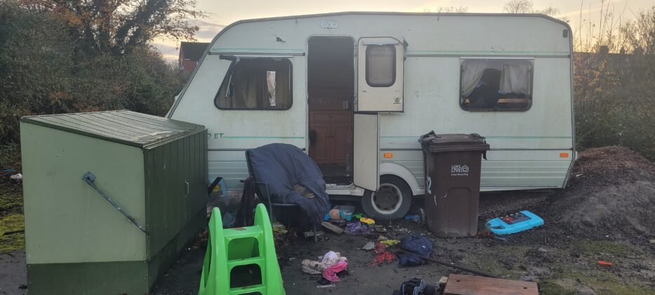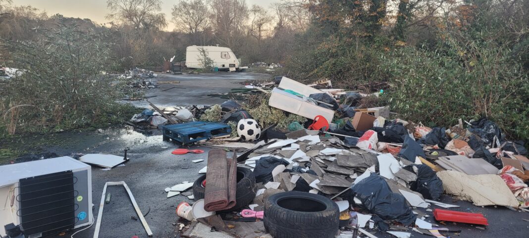 Much of the site is strewn with rubbish, with piles of household, garden and building waste covering a large area. An abandoned caravan and camping equipment complete with mattresses, clothes and children’s toys has been left amongst the rubbish.