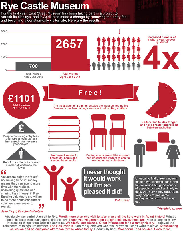 The directors of Rye Castle Museum recently took the bold step of making entrance to the East Street site free, with the hope of visitors then giving a donation. As you can see on the graphic above, this has resulted in a large increase in visitor numbers with a knock-on effect for visitors to the Tower.