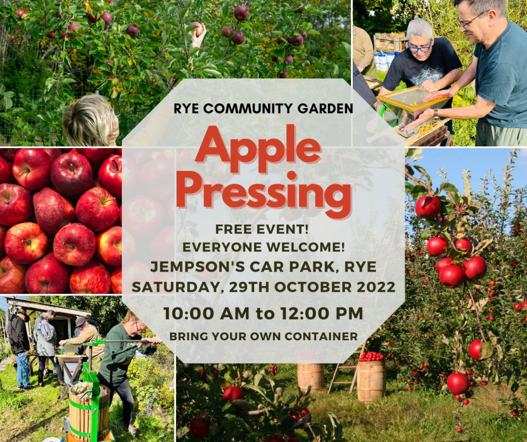 Rye Community Garden is hosting a free apple pressing event this Saturday, October 29, in the Jempson’s car park in Rye to bring awareness to the sweet and delicious benefits of gleaning fruit from local apple and pear trees instead of letting the fruit drop and go to waste.