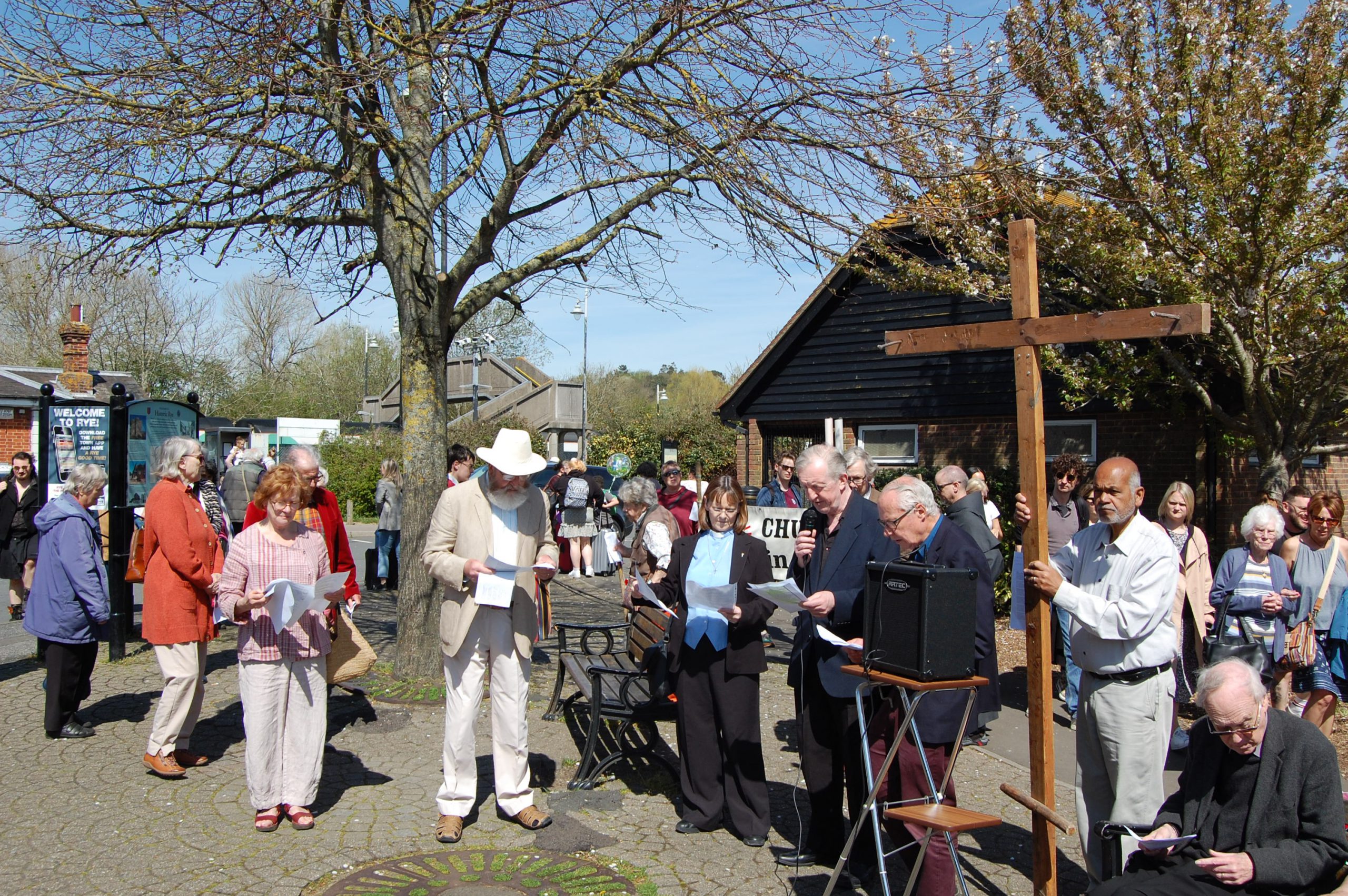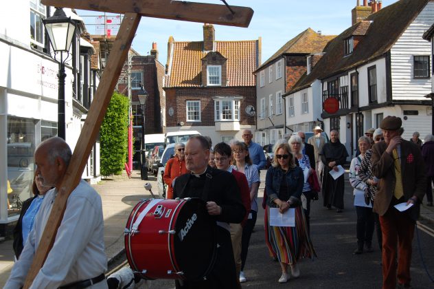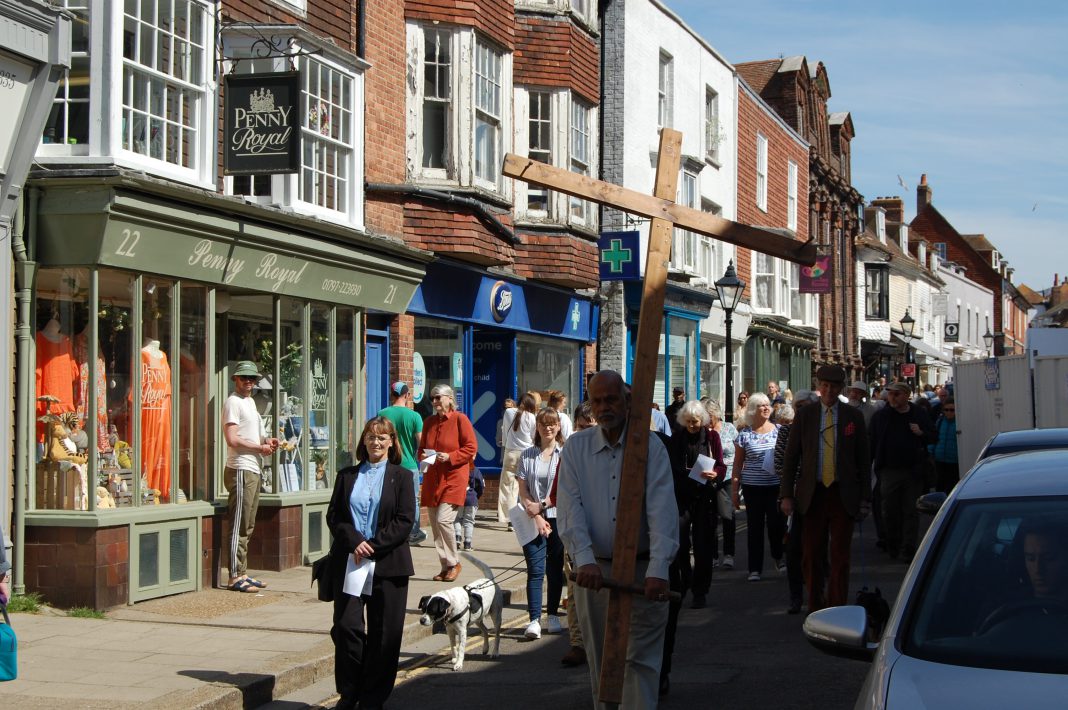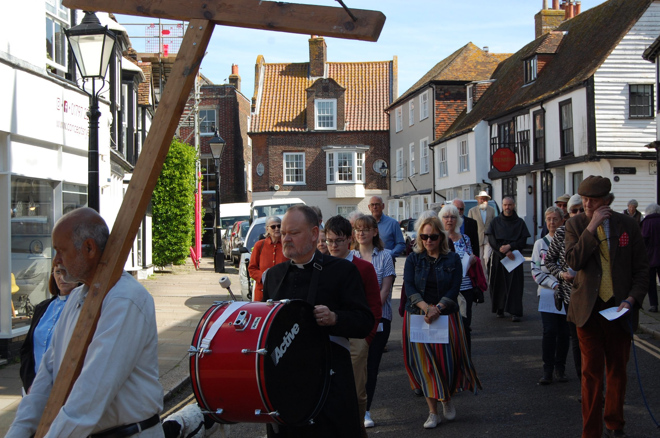 We sang a hymn, unfurled the banner and charged the willing bearer, Nizam Mohammed, to carry the cross. Then we set off following the cross and Revd Paul White, sounding the solemn drumbeat at every fourth step. Passing down to the High Street and into The Mint, we came to the Strand, watched by many curious and not so curious passers-by. Another stand, another hymn, and then on we walked behind the cross and the ever-resounding drumbeat to the final assembly point on Station Approach. It was a moving experience.