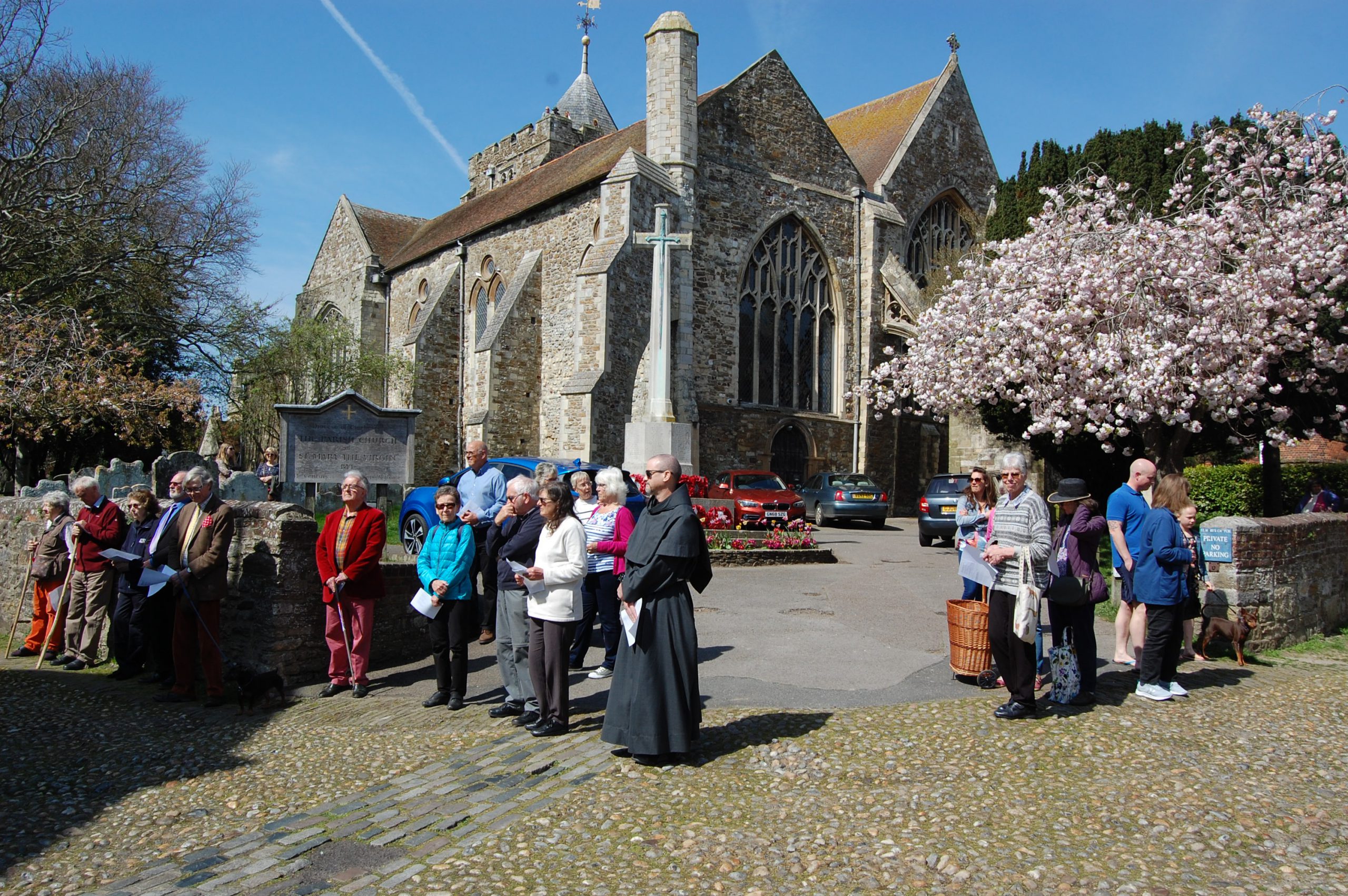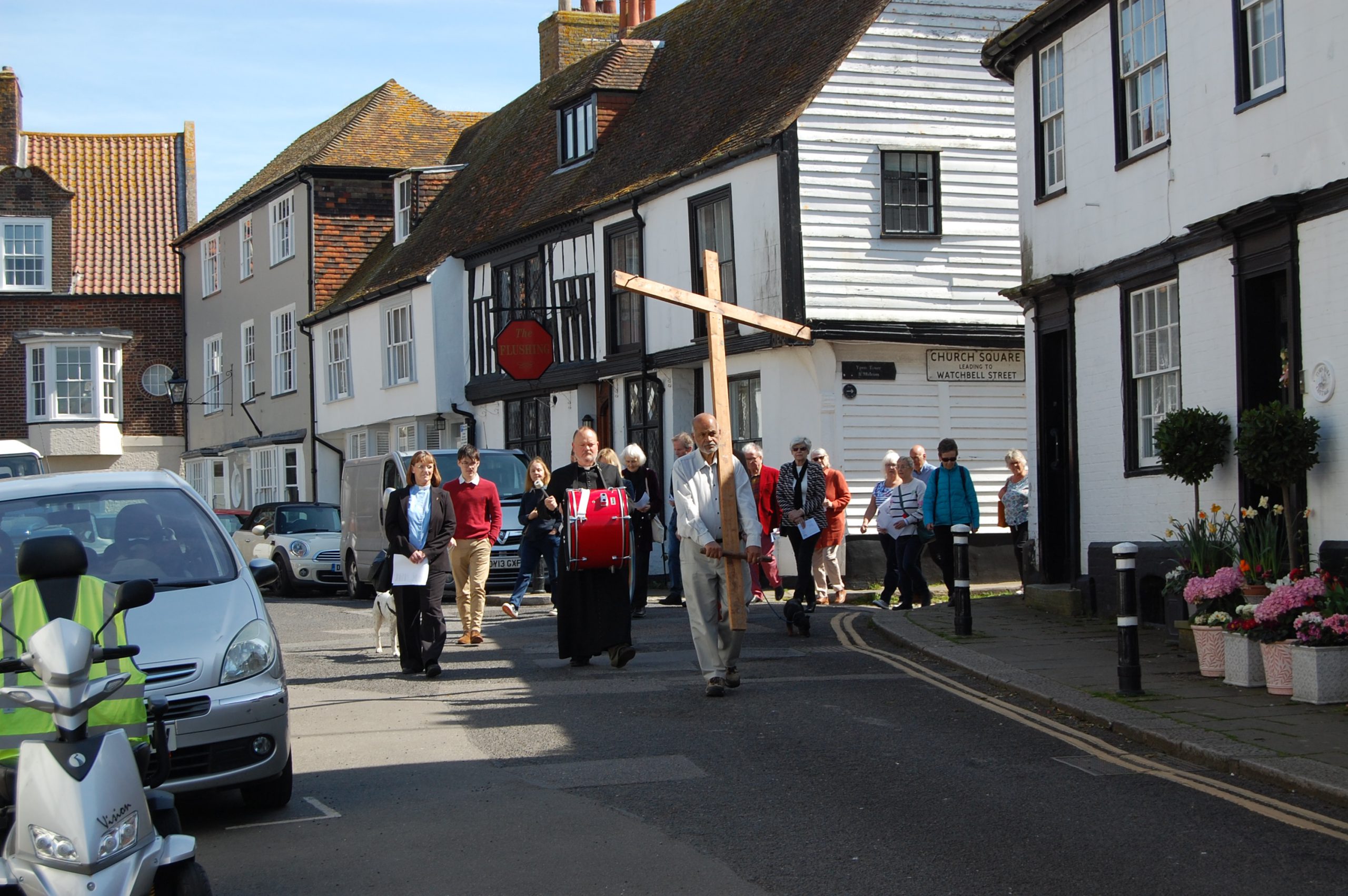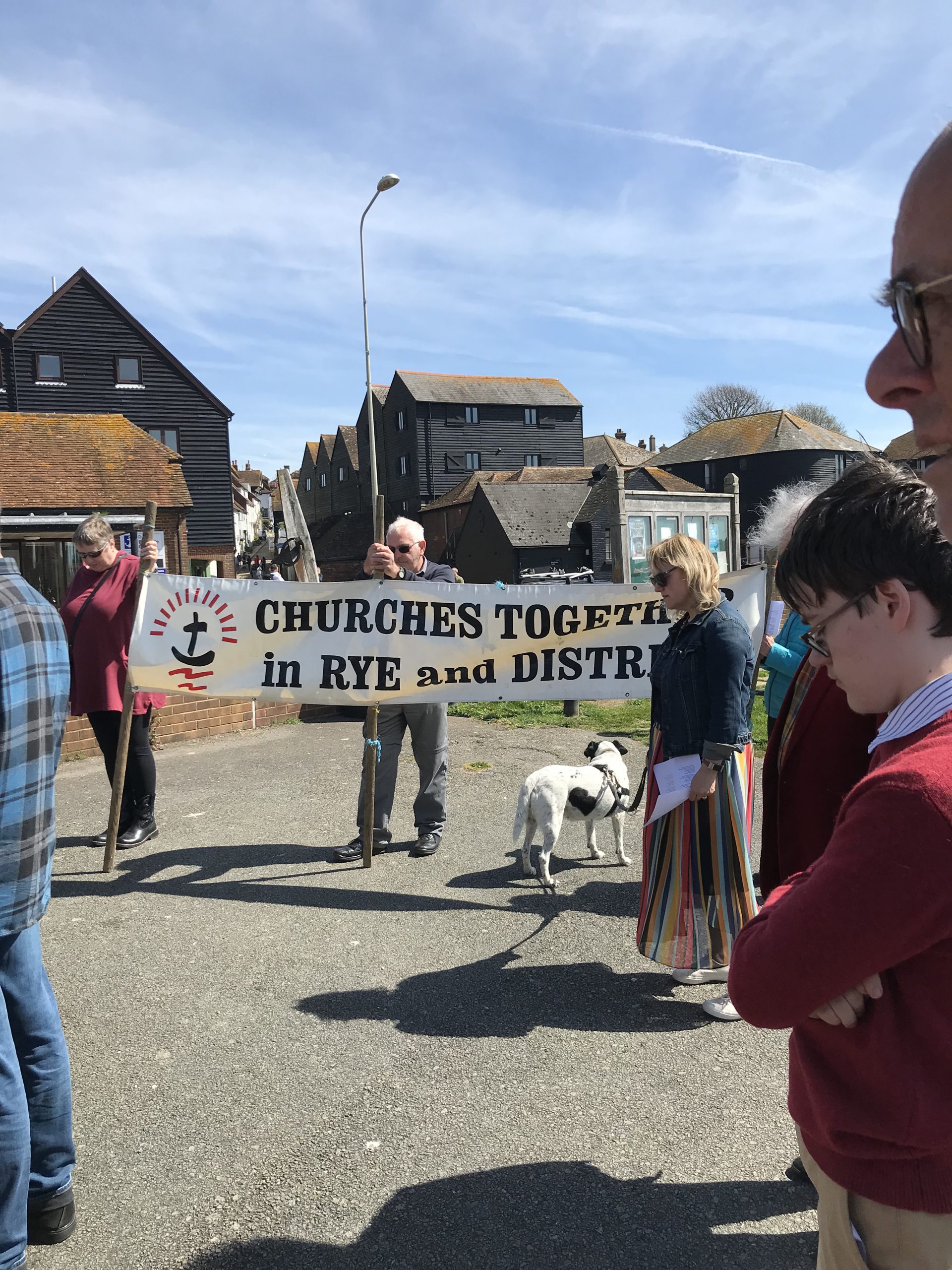 We sang a hymn, unfurled the banner and charged the willing bearer, Nizam Mohammed, to carry the cross. Then we set off following the cross and Revd Paul White, sounding the solemn drumbeat at every fourth step. Passing down to the High Street and into The Mint, we came to the Strand, watched by many curious and not so curious passers-by. Another stand, another hymn, and then on we walked behind the cross and the ever-resounding drumbeat to the final assembly point on Station Approach. It was a moving experience.