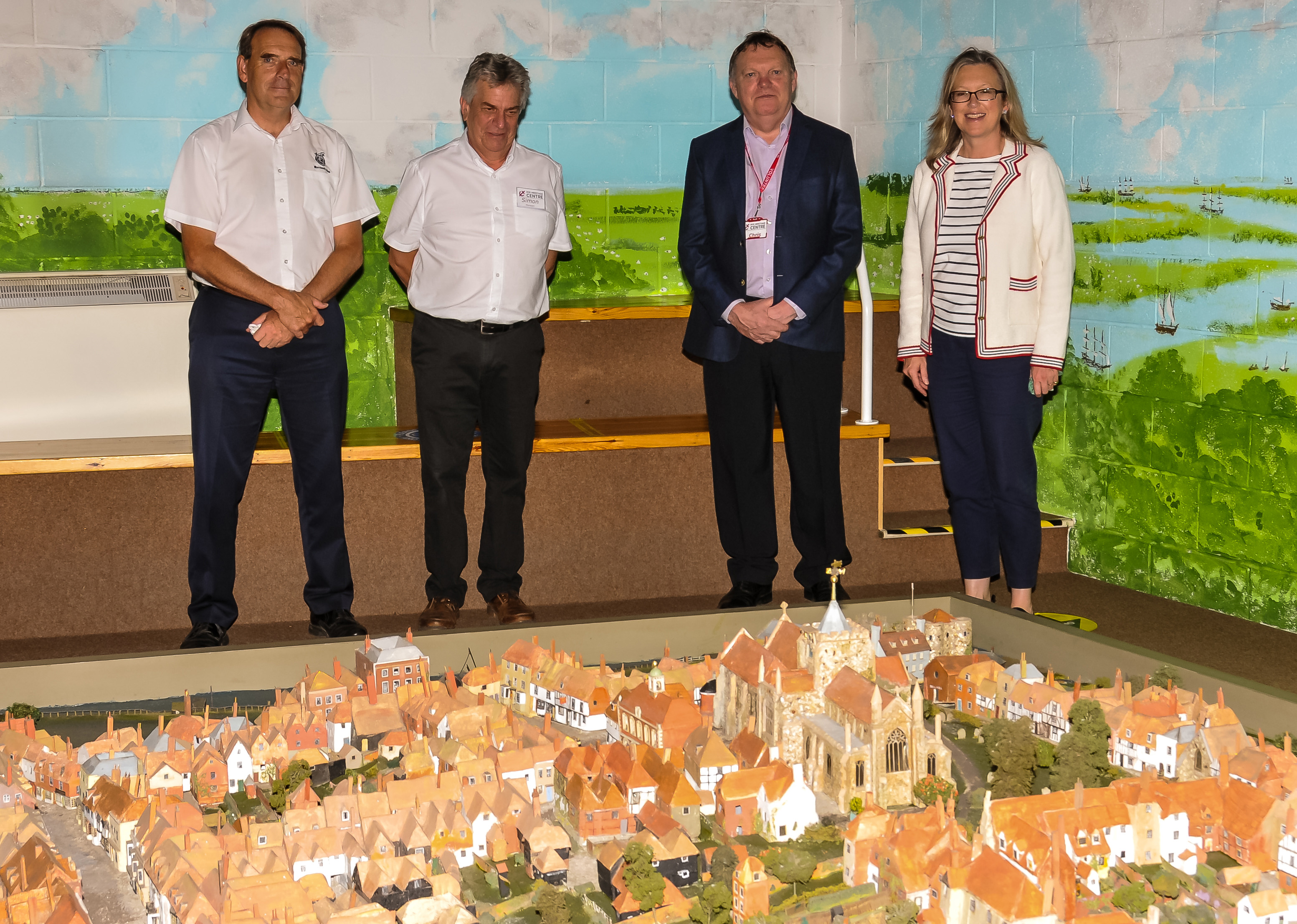 Sally-Ann Hart, Conservative MP for Hastings Rye, admires the Rye town model. L-R: Martin Blincow, Simon Parsons, Chris Hoggart, Sally-Ann Hart