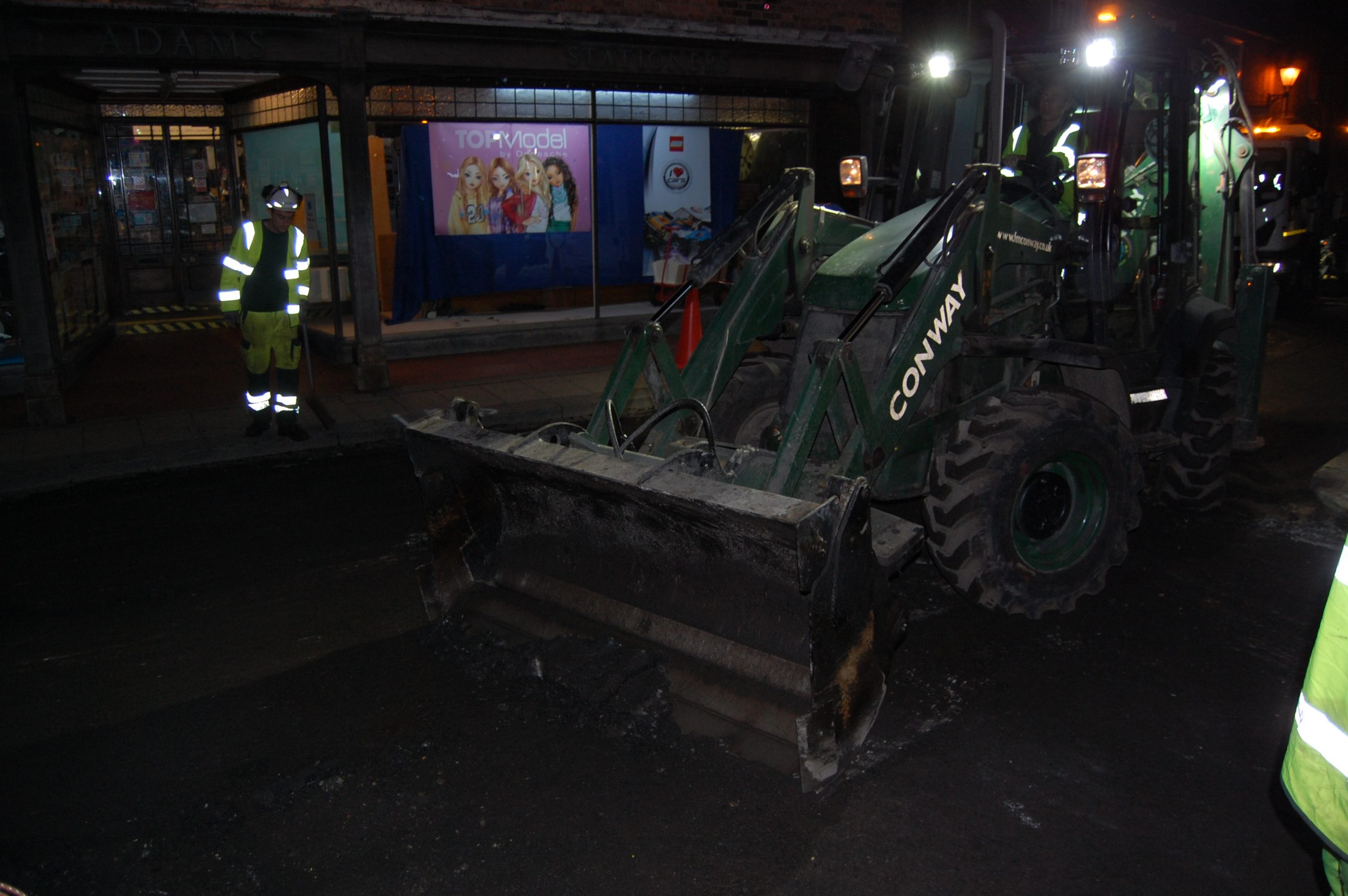 For hard worn areas such as the turn into East Street, scraping equipment was deployed to remove several inches of the top surface before re-laying with tarmac. This was the noisiest part of the operation and must have disturbed residents’ slumbers, if they could have got to sleep at all.