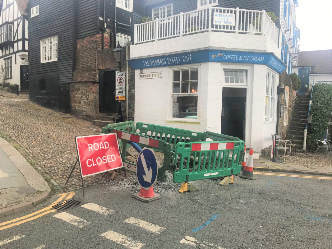 By Monday, July 6, Clancy Docwra had excavated the cobbles with new pipework awaiting connection, in the meantime the road was temporarily closed at the base of Mermaid Street with the junction of The Mint.