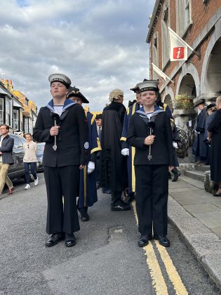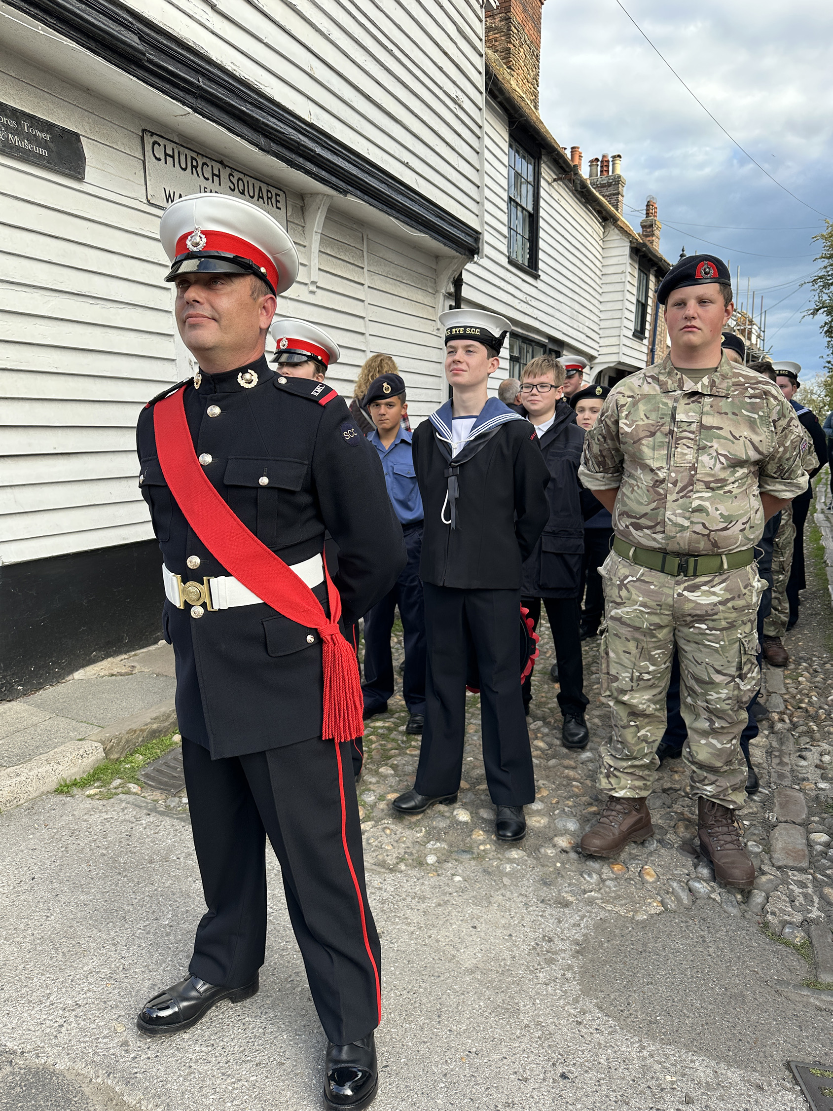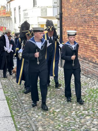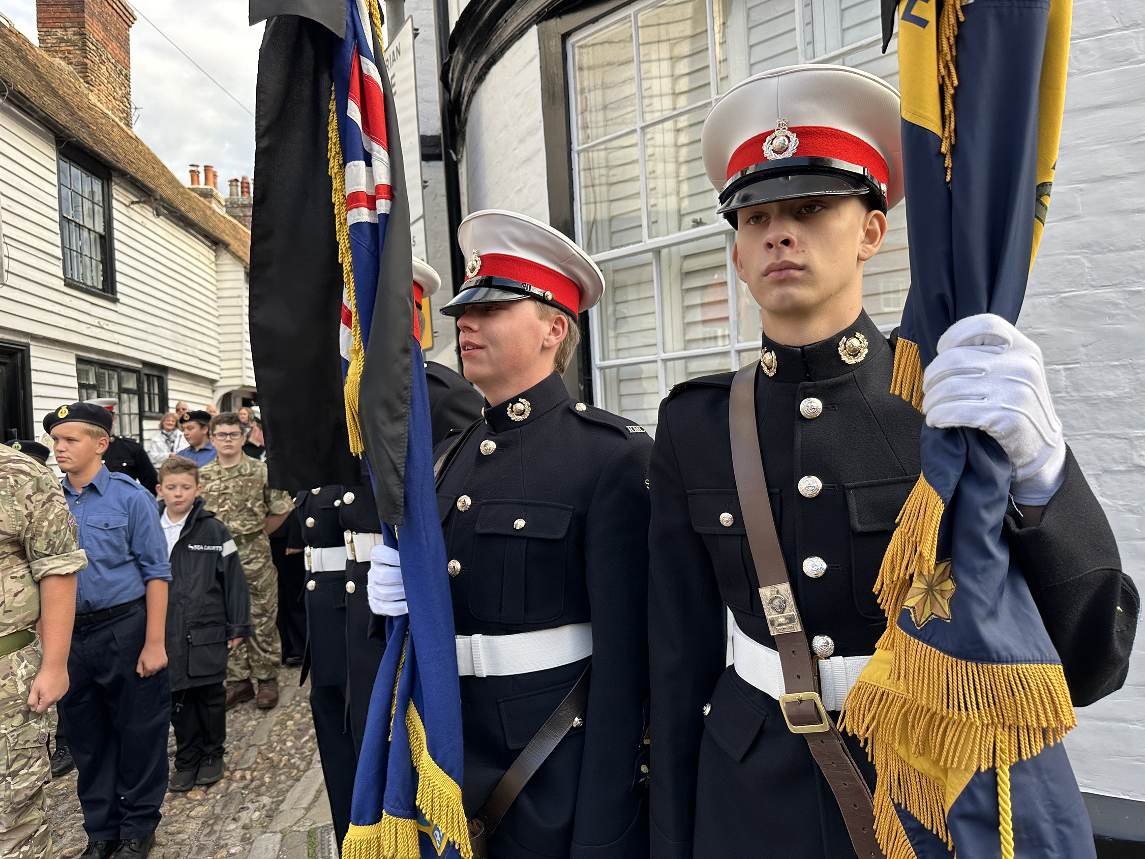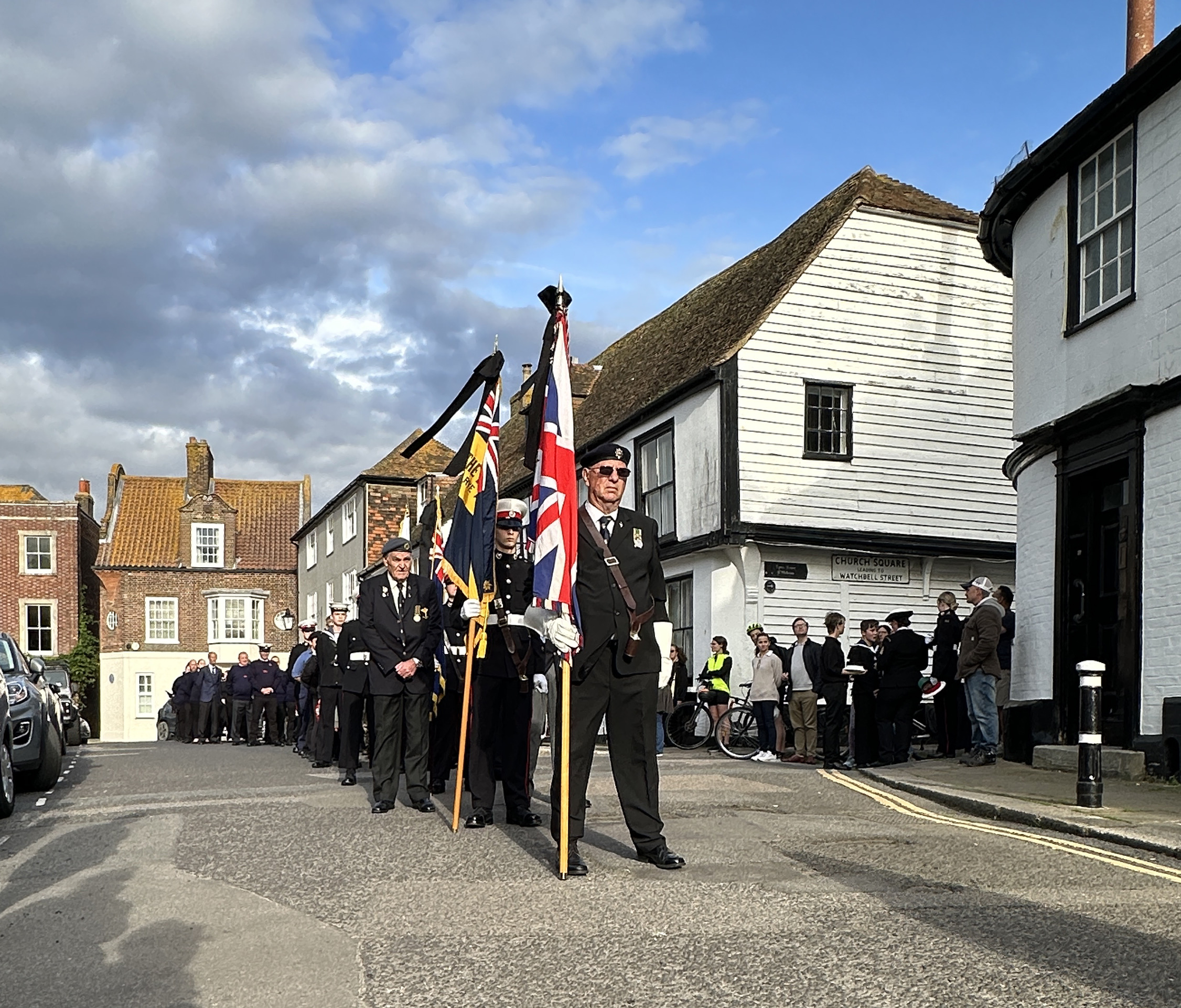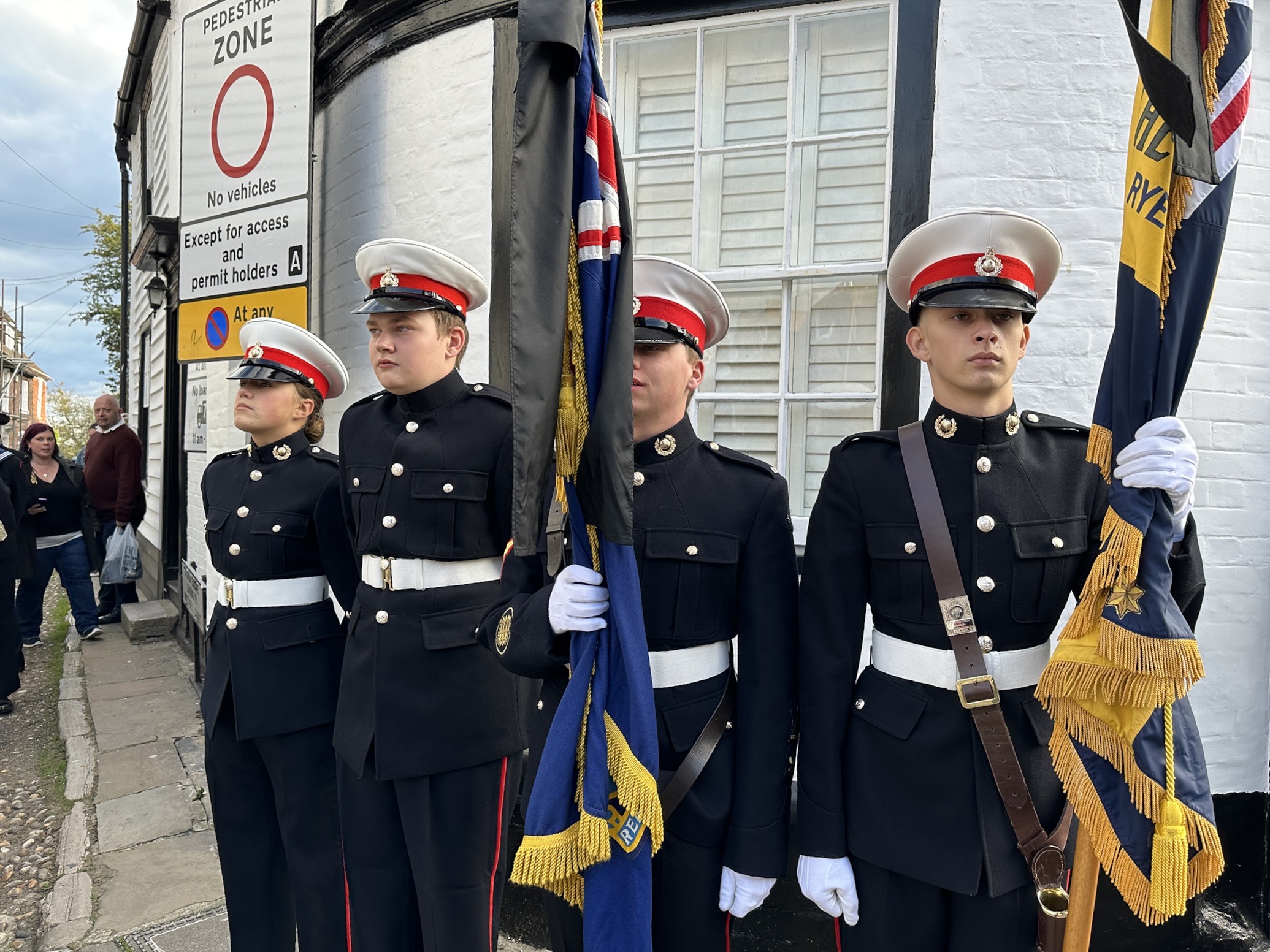 The Royal British Legion (RBL), Sea Scouts and RNLI standards were paraded with representatives from all three services. The procession formed in Market Street while the mayor and council took their post in the Buttermarket.
