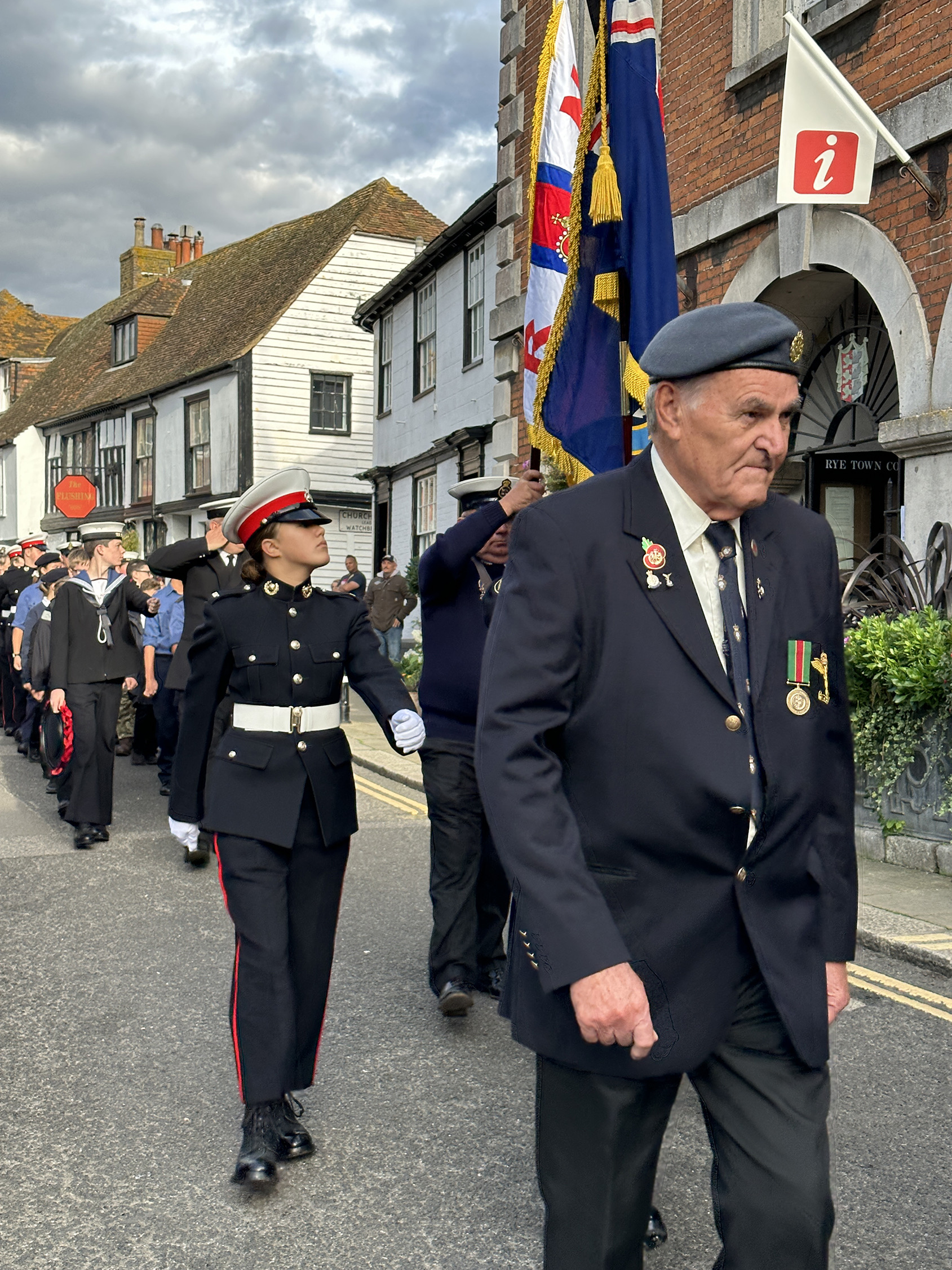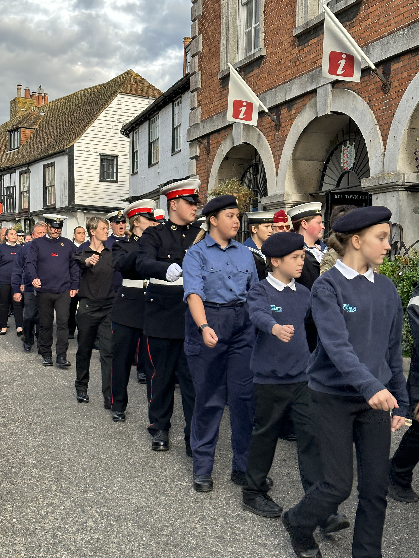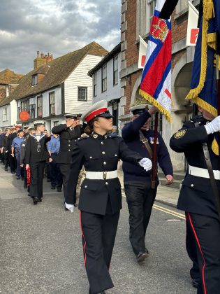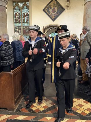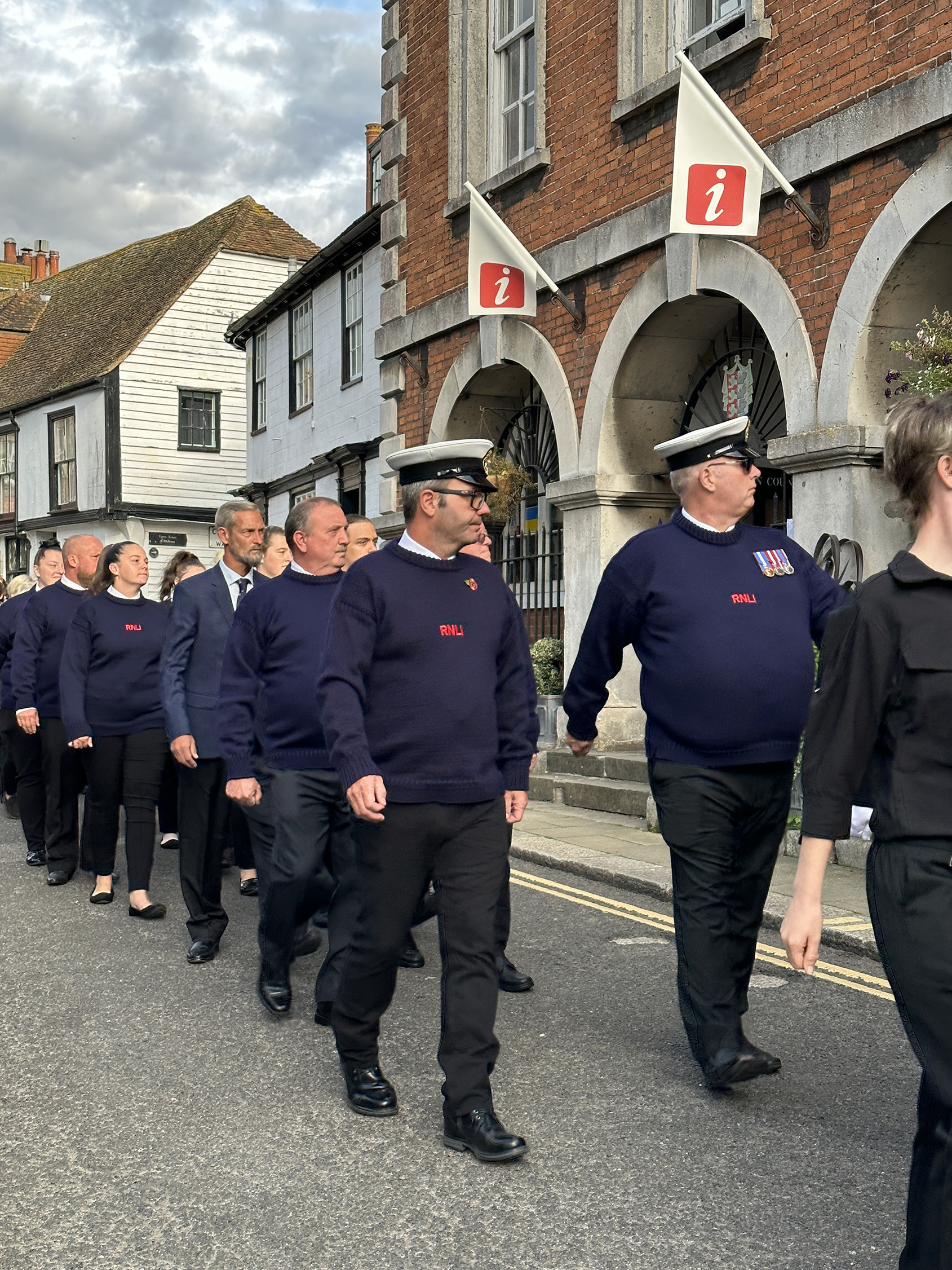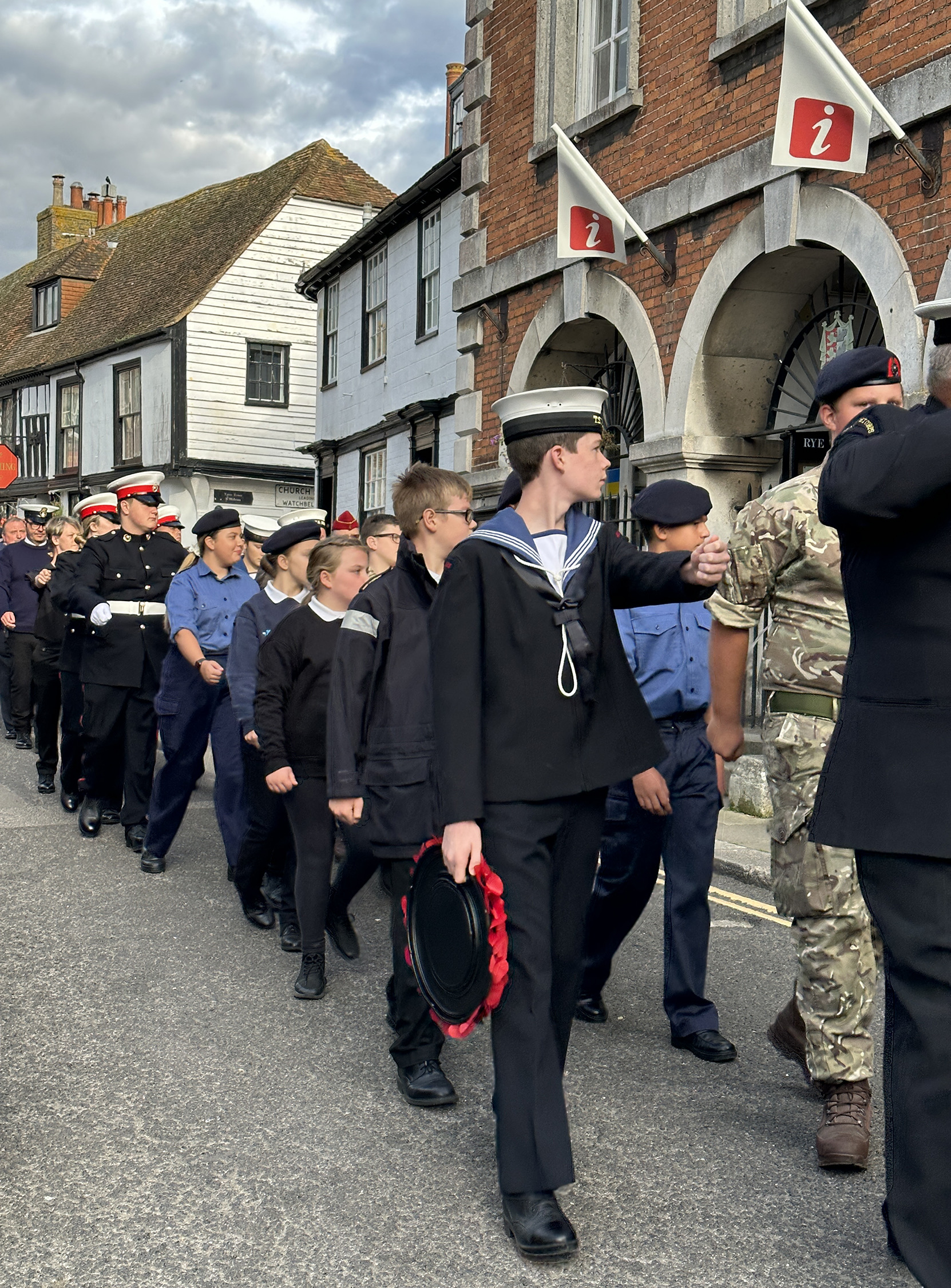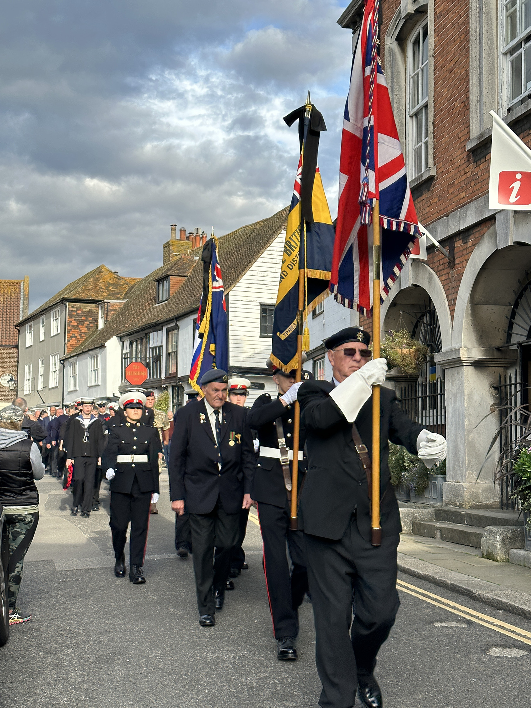 The Royal British Legion (RBL), Sea Scouts and RNLI standards were paraded with representatives from all three services. The procession formed in Market Street while the mayor and council took their post in the Buttermarket.