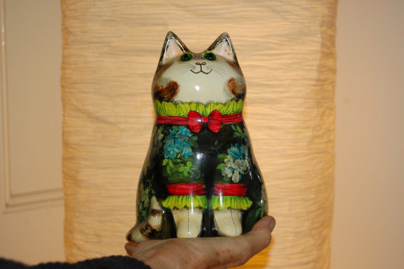 3. David, it sounds like one of the later cats that were made by either Rye or the Cinque Ports potteries. These Joan painted and either returned for firing to the pottery or varnished them herself. Later still the potteries began producing the finished cats to Joan’s designs, such was the demand. These later cats often have flat eyes while the earlier ones are raised off the surface. Cats painted by Joan have a year date, a number and the letter C in a circle for copyright, followed by her name and a place, usually Rye.