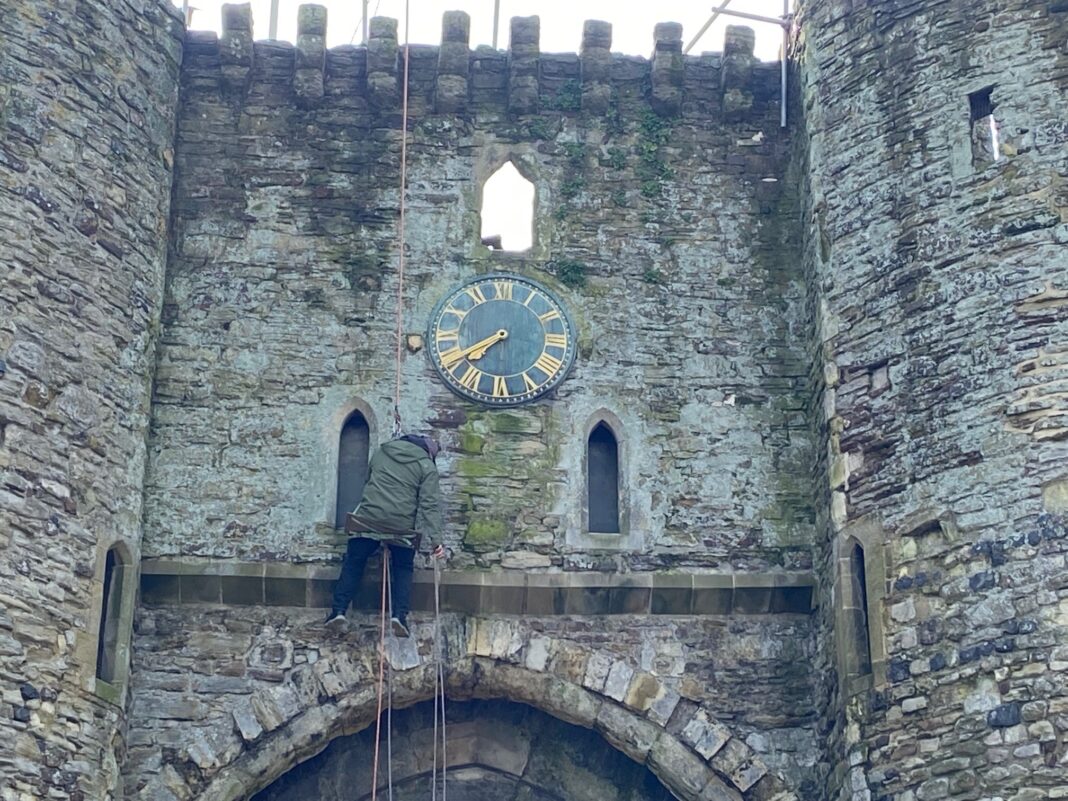 One man was competently wrangling the traffic from Cinque Ports Street while the other, dangling but securely held by ropes, cleaned moss and green foliage off the stonework around the clock. On the day they had cleaned up the other side: they were doing a beautiful job.