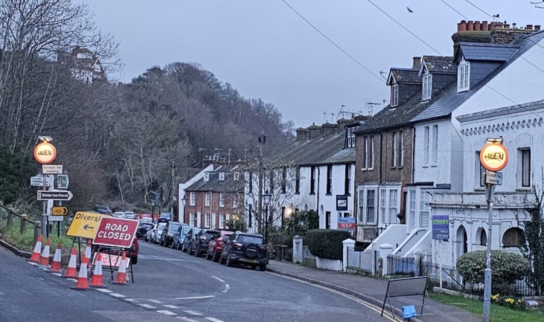 On Tuesday afternoon there was a significant landslip of topsoil and vegetation onto Military Road, 200 yards to the east of the Globe Inn. After the recent heavy rainfall, ground water in the Rye Hill escarpment had loosened the surface, causing several tons of debris to slip and block the road. At 7:30 am on Wednesday February 21 the road remained blocked.