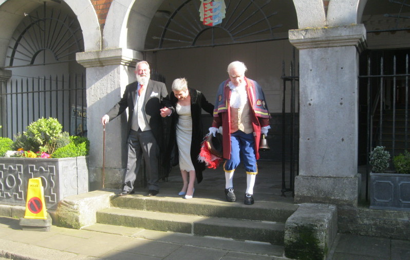 Camera’s clicking as the pair made their entrance, Julie was in a cream dress, looking beautiful and Phil in tails, beard trimmed and tidied, looking the gent, not ever seen before (not by me at least, since I have known him), both looking very happy. Vows were taken, the book signed and rings exchanged as well as a beautiful poem was read about life together. The town Cryer was doing his duty shouting pleasantries about the happy wedding while leading them out into the street where people waited for more photo-opportunities.