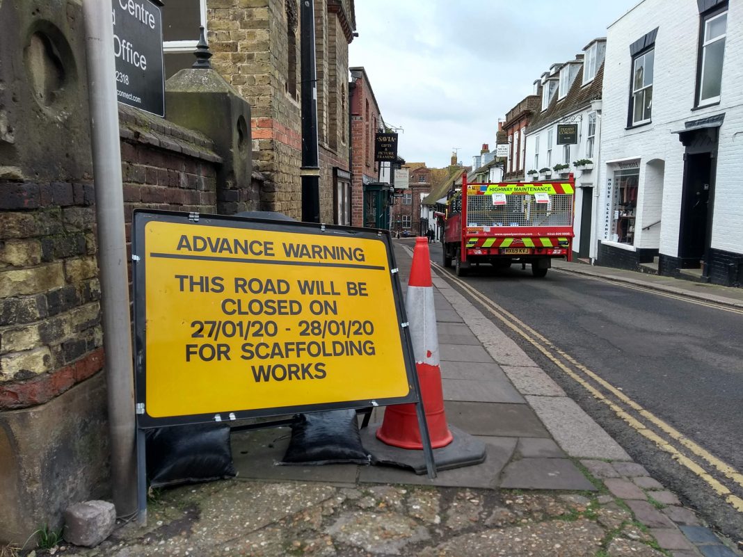 And in Market Street by the town hall, and at the top of Lion Street by the Kino cinema, there are signs warning of the road closure, specifically for the erection of scaffolding, next Monday and Tuesday January 27-28, alongside the George hotel, which has been closed since the fire in the summer.