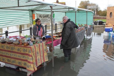 Following this week’s experience it seems likely that the stalls for the Farmers Market may have to move up the slope a bit. A month ago the water was just lapping into the back of the stalls under the canvas. But this time the water forced customers back from the stalls, and one stall holder (lacking wellie boots) abandoned ship, after rescuing what boxes and crates he could.