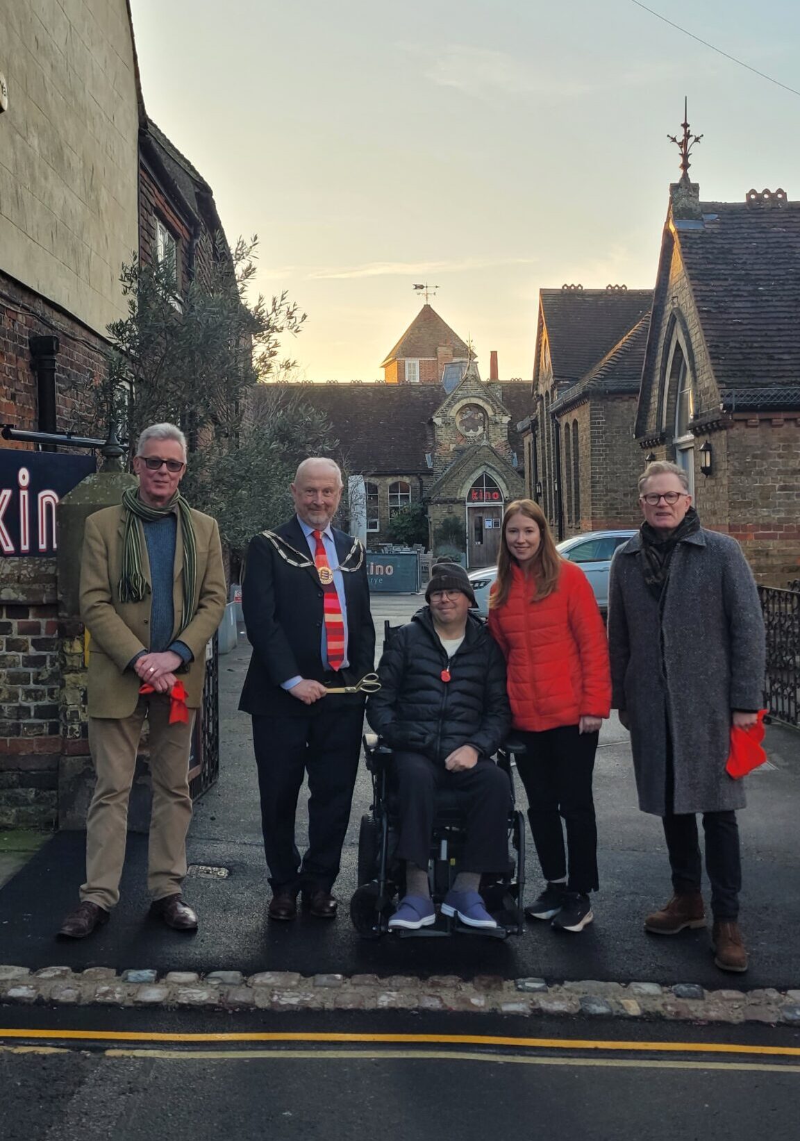 The new dropped kerbs in the High Street and in Lion Street outside the Kino were officially opened by Dan Lake on Friday 21 November, having been installed by East Sussex Highways. Dan, who has led a year-long campaign to improve accessibility for those of limited mobility, was accompanied by Hastings and Rye MP Helena Dollimore, Rye Mayor Andy Stuart and Councillors Mike Boyd and Simon McGurk, who have actively supported his campaign.