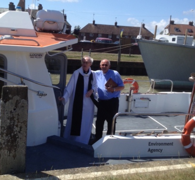 As the high tide peaked on Sunday, July 19, the Harbourmaster’s launch (pictured) brought St Mary’s Rector Canon David Frost and Canon Richard Orchard to the Strand for the Churches Together in Rye’s celebration of Sea Sunday, where they were joined by other clergy, the sea cadets, the yacht “Windrose” and a small congregation, together, from time to time, with visitors and passing motor boats, writes Charles Harkness The hymns, accompanied by David Frost on an electric organ, all seemed very appropriate with references to “O still small voice of calm”, “Boundless as ocean’s tide, rolling in fullest pride” and “O hear us when we cry to thee, for those in peril on the sea”.
