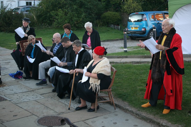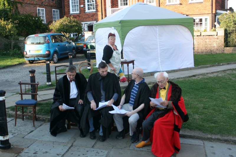 This hilarious play, written by Dilys Mayor and performed out of doors in front of the Ypres Tower over the Bank Holiday weekend, opened with a secret meeting of just the male town councillors, all called Breeds. Mayor Breeds informed them that Bother District Council had decided to cut Rye loose, sick of their constant complaints about car parking, rubbish collection and the proliferation of holiday homes (sound familiar?). From now on, Rye would have to go it alone and manage all its services itself. The discussion was overheard by a “cleaner” who informed all the women town councillors. Then the town’s water supply was cut off.  The male councillors arranged to meet for coffee the following morning but were unable to think of anything practical to do. The lady councillors then arrived and suggested that they could mobilise the volunteer organisations, all run by ladies, to help. The councillors agreed to meet at the town hall.