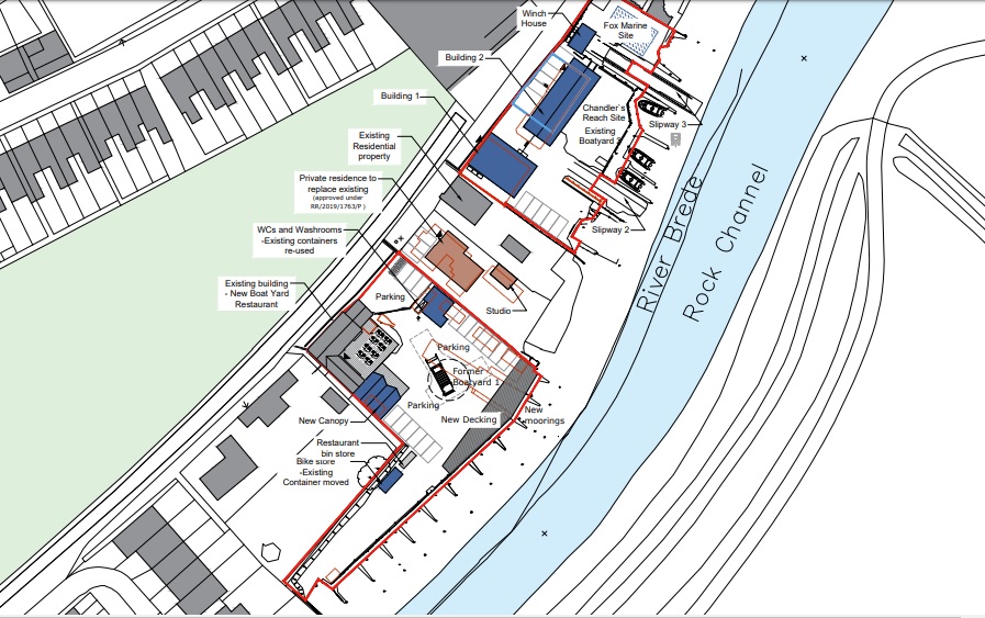 Called Sandrock Marine on Rock Channel, the mixed use development will span two plots along the river. One site will contain a restaurant with around 100 seats (split between indoor and outdoor seating, and includes an outdoor barbecue area) and the other site will consolidate commercial, office and boatyard uses in a new purpose built facility.