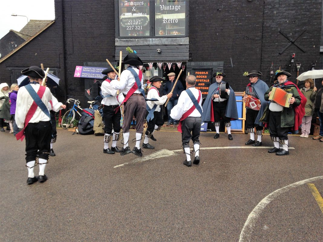 Hearing the sounds of sticks being hit together and seeing a crowd gathering, curiosity led across the road, to find a group of morris men outside the little antique shops. Encouraged to perform by an enthusiastic gathering, and accompanied by an accordion, the tinkling of bells and energetic leaps and jumps, they were very entertaining. Some of the tourists from faraway places looked totally bemused, but enchanted.