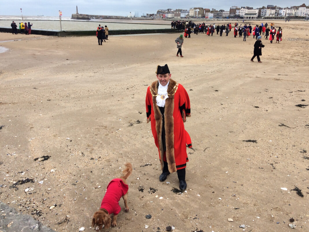For the first time in four years (because of Covid and port duties), we were able to attend the Blessing of the Sea at Margate on Sunday, January 7. The event is organised by the Greek Orthodox community in Margate and is centred around a blessing on the beach to the sea, followed by a small child diving into the sea, although this year because the tide was out the youngster jumped eagerly into the boating pond. And not for long, because the wind was bitter and we were cold in mayoral robes so the poor thing must have been frozen. It is an annual event and it was wonderful to finally be able to see the religious leaders, in their full regalia, leading the service. A big thank you to Margate for such excellent organisation, and it was a pleasure to see so many other Cinque Ports mayors there too.