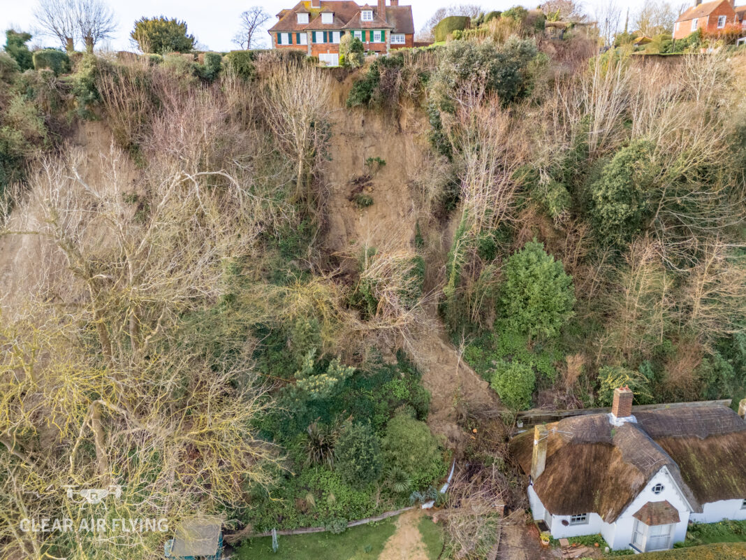 Meanwhile drone shots taken by Stuart Cooper from Clear Air Flying in Winchelsea have revealed the extent of the damage caused by the landslips. The pictures and video show the large cracks in the cliff face, fallen trees, the piles of mud and rock, and also just how close the cliff edge has come to properties on Point Hill.